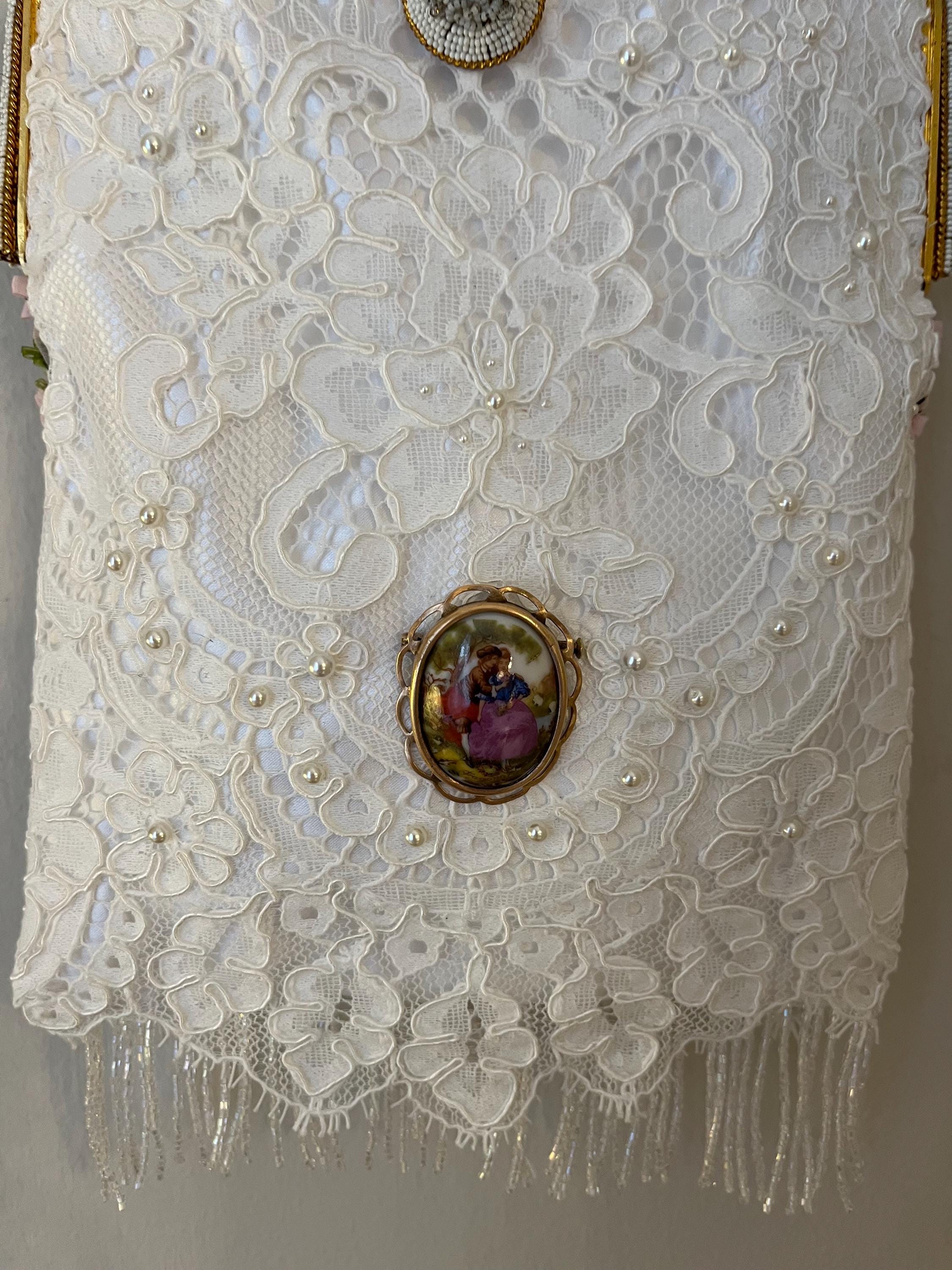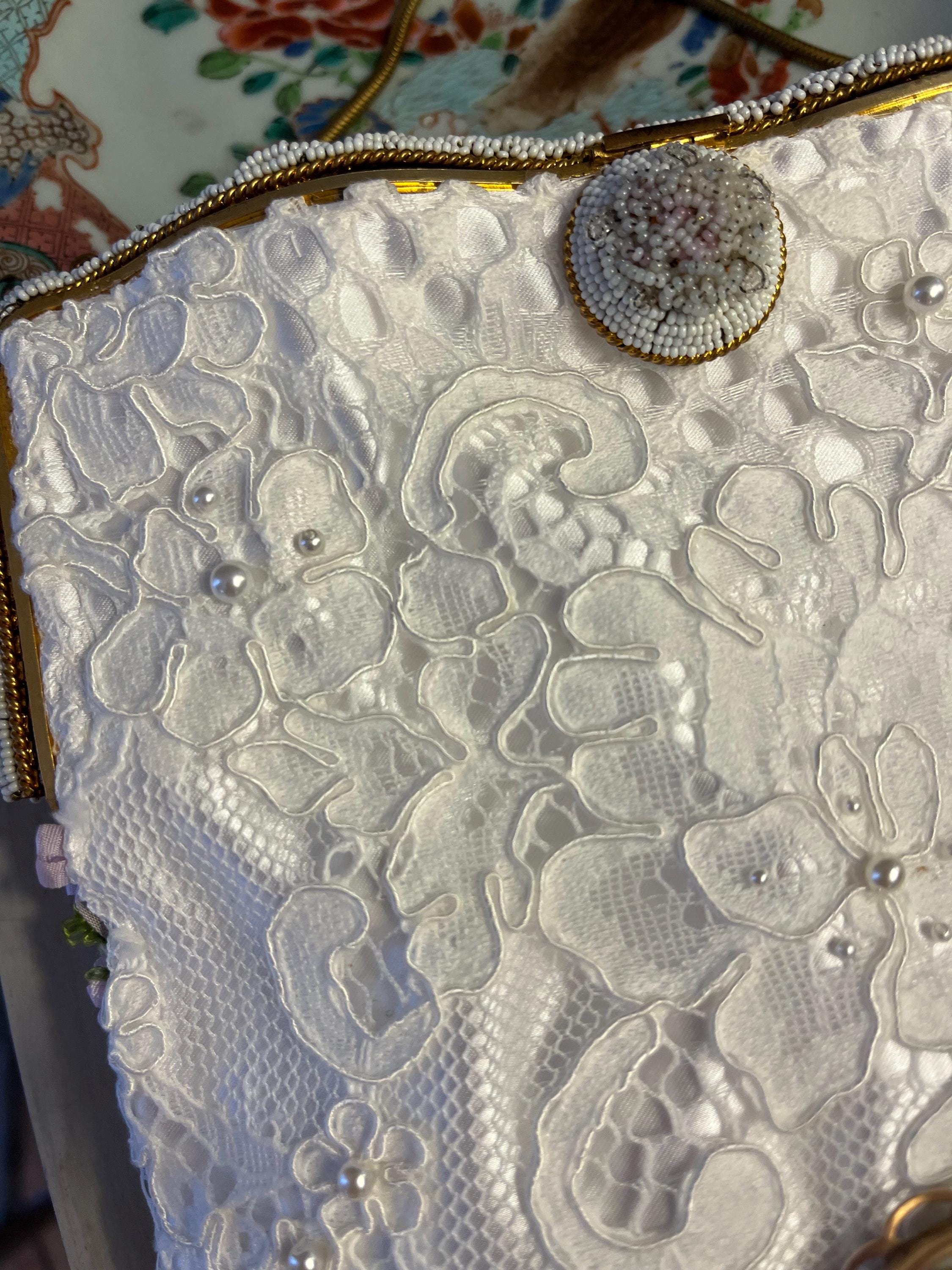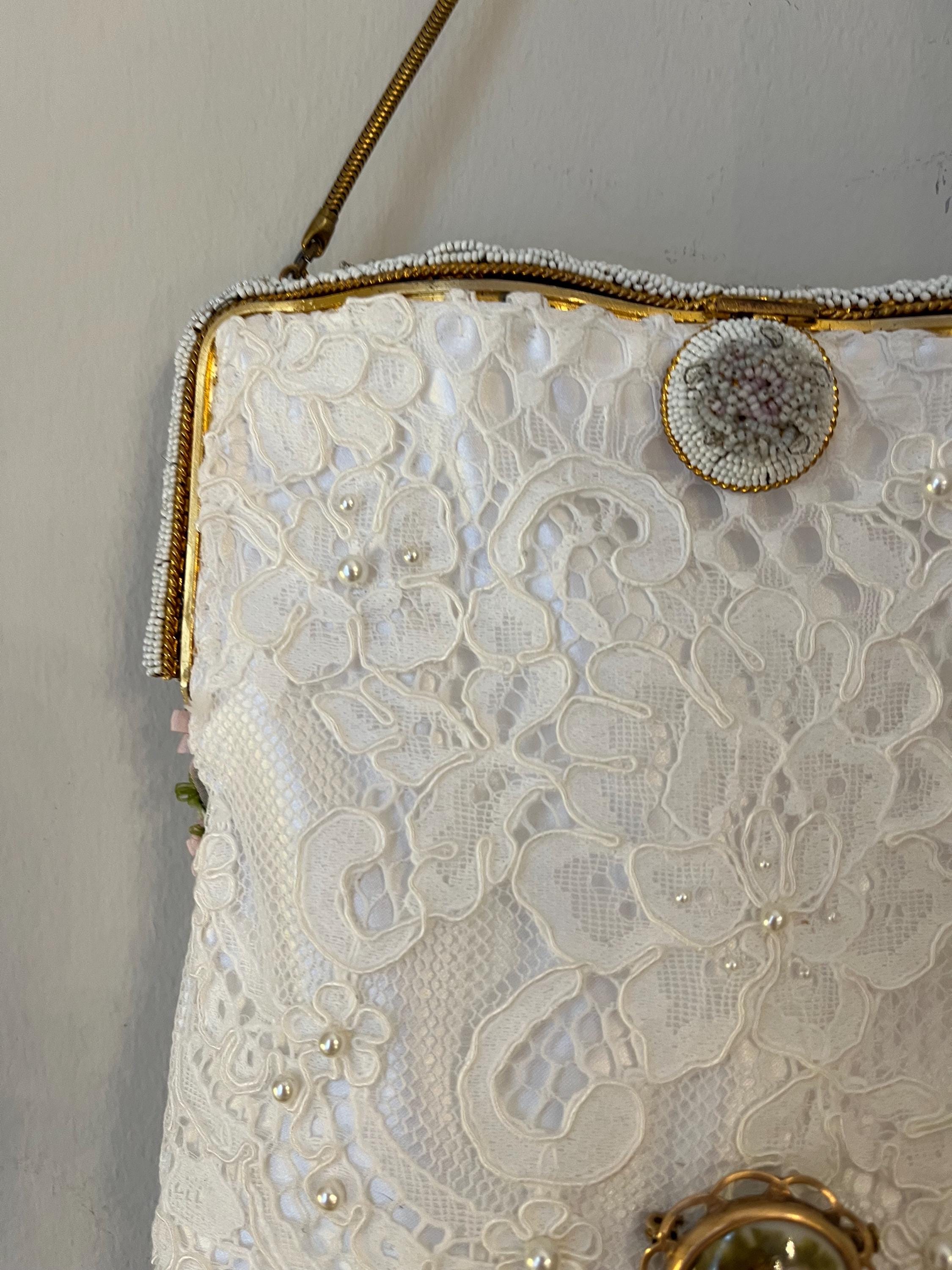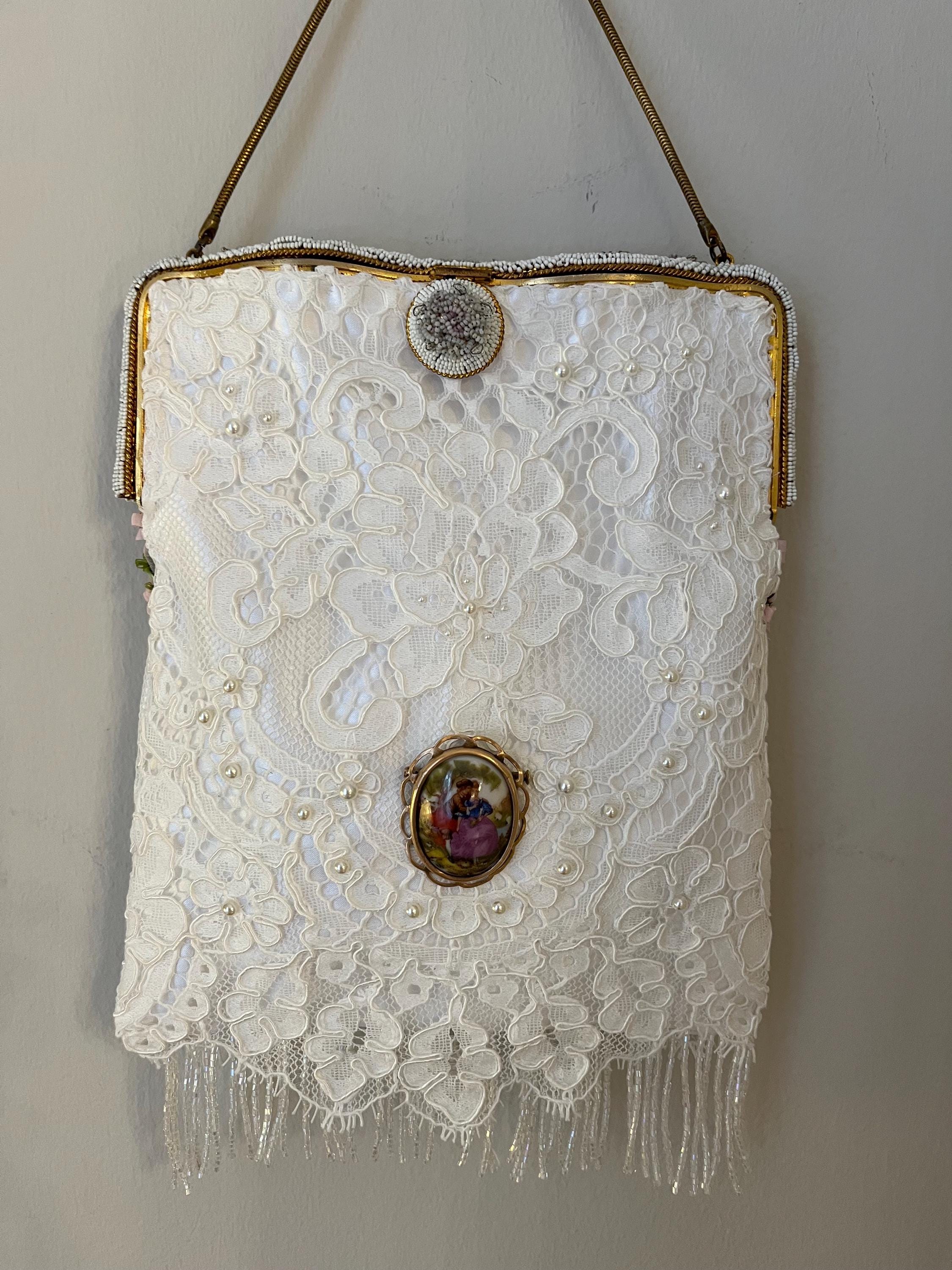 The bag itself is made in french off white corded lace hand beaded and stretched over off white