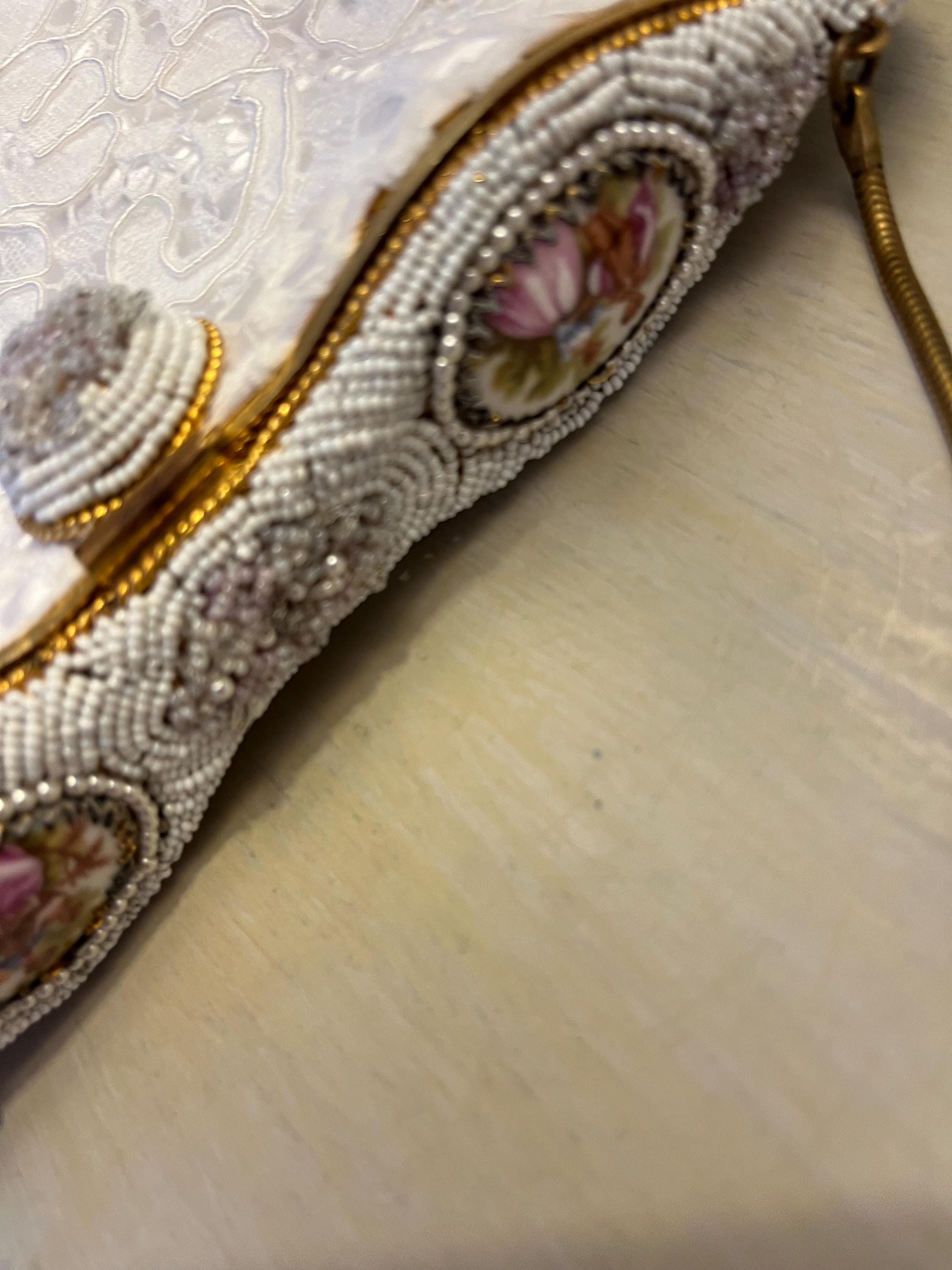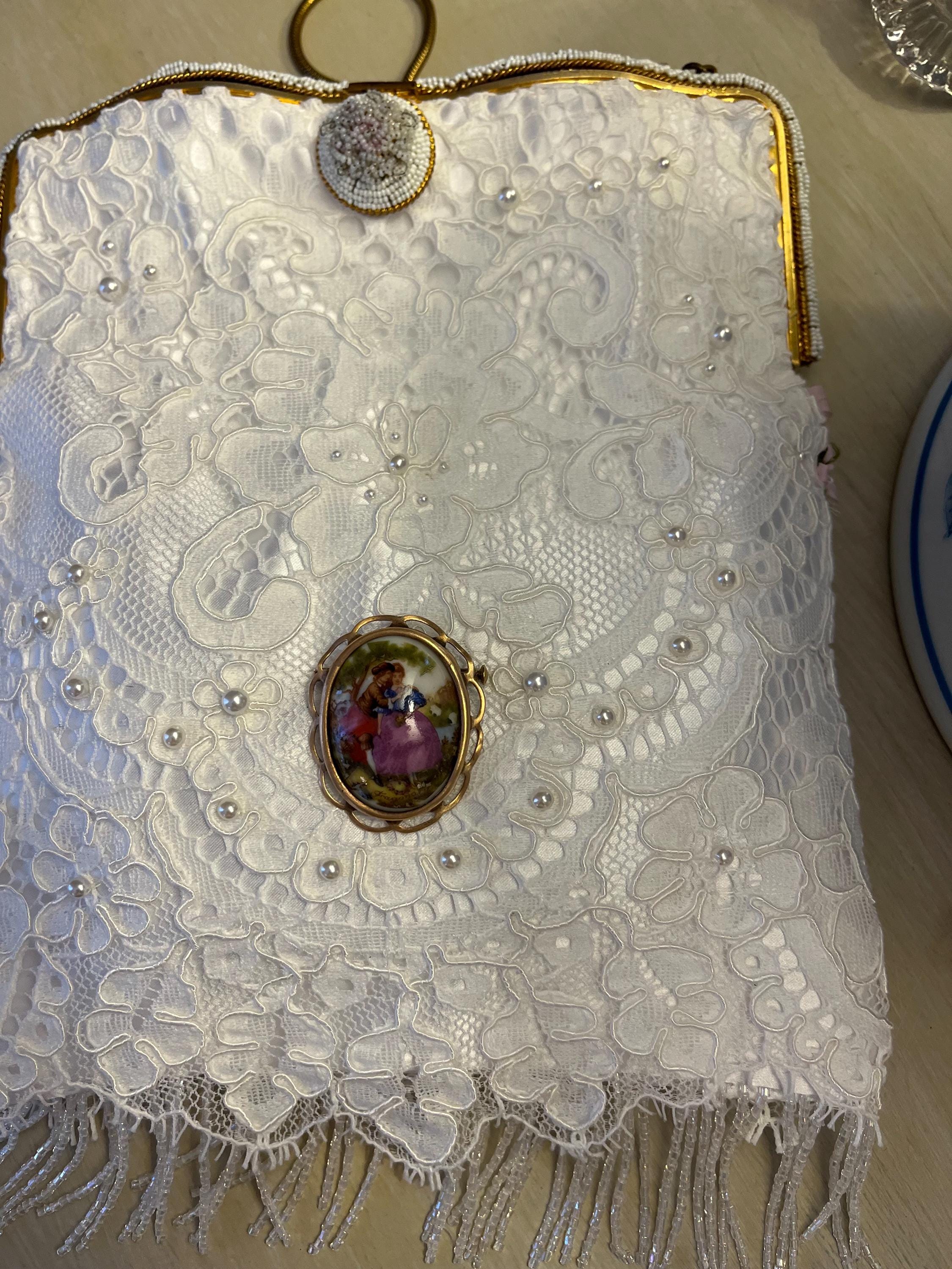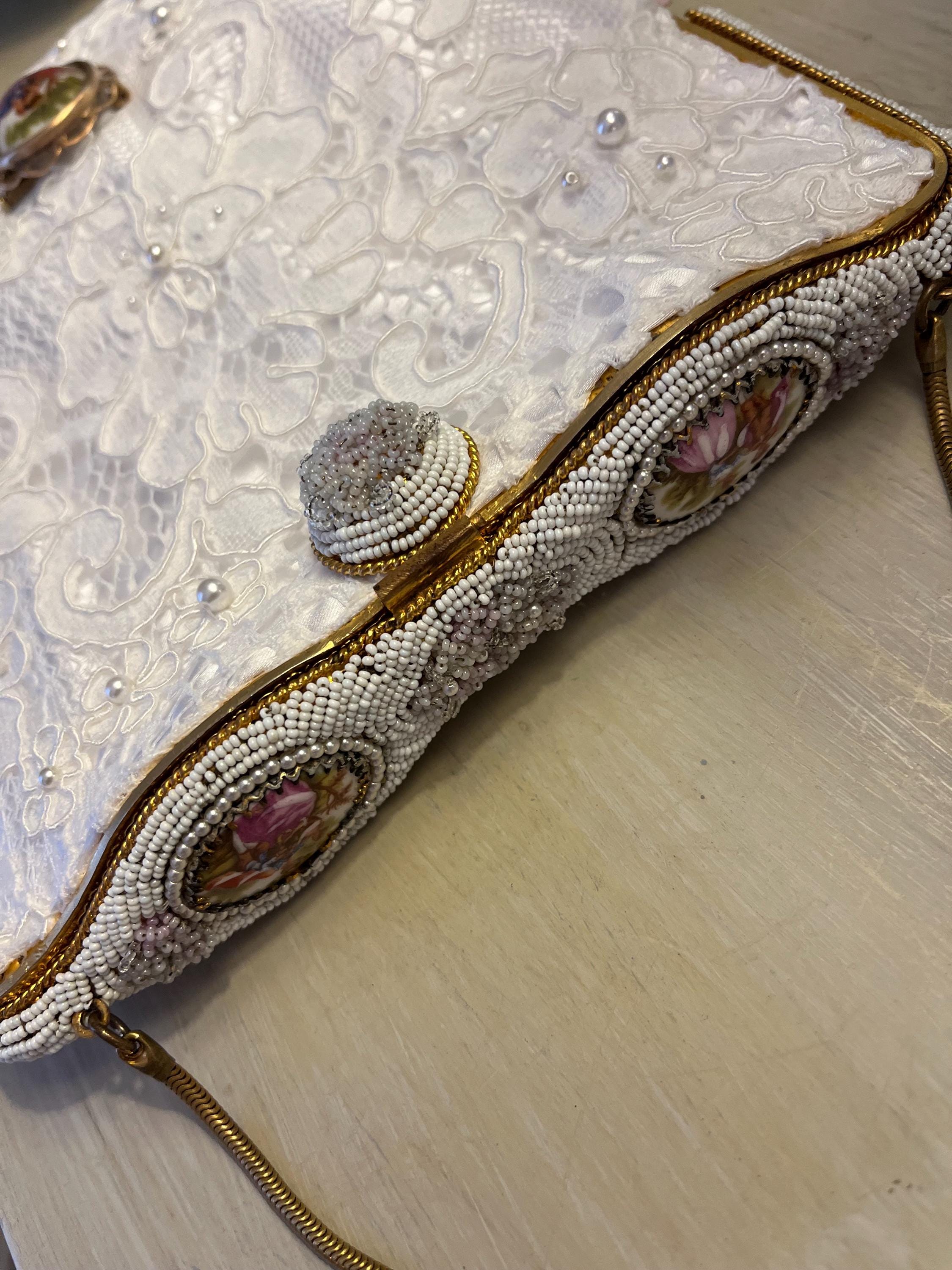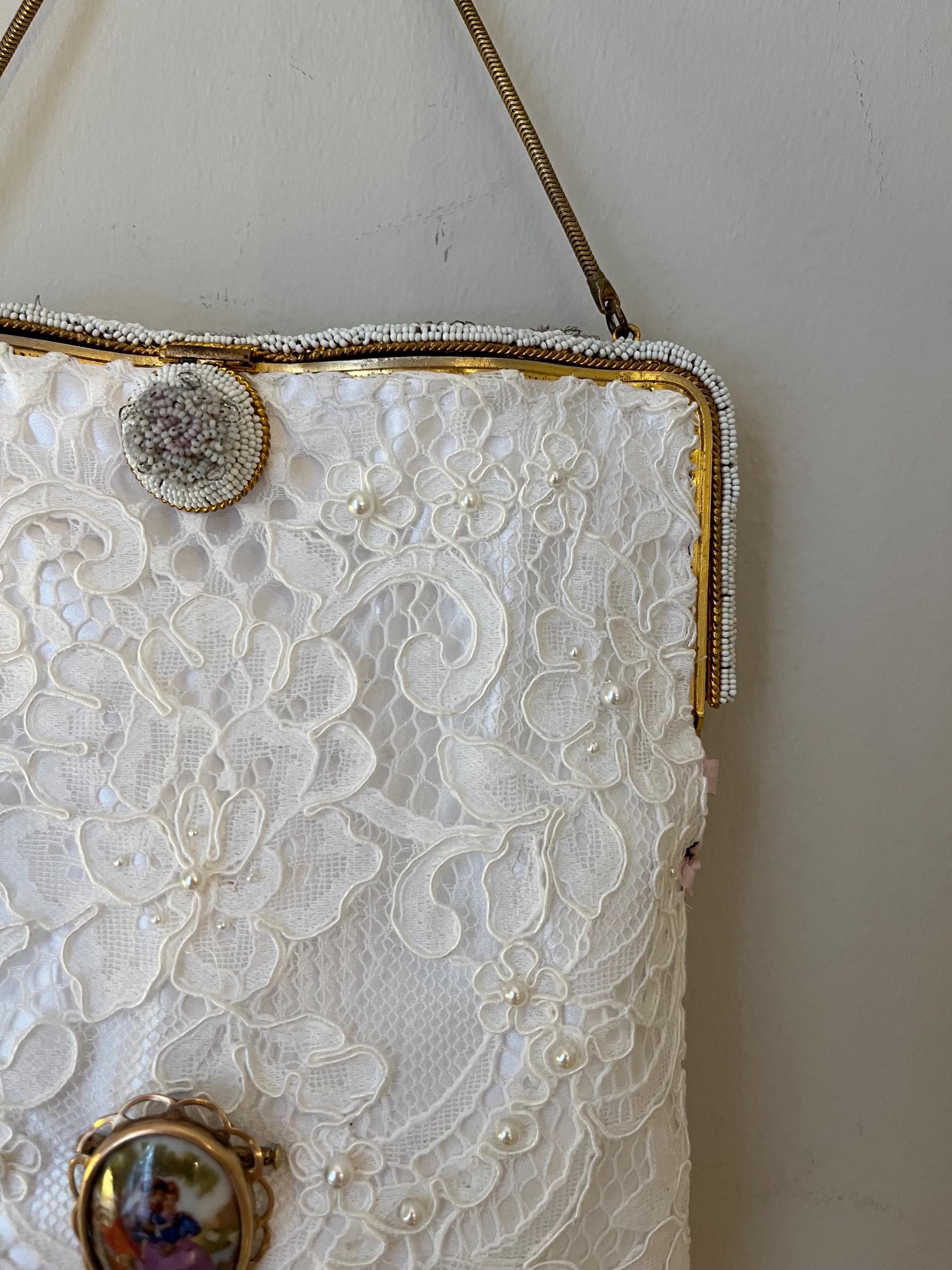 The bag itself is made in french off white corded lace hand beaded and stretched over off white