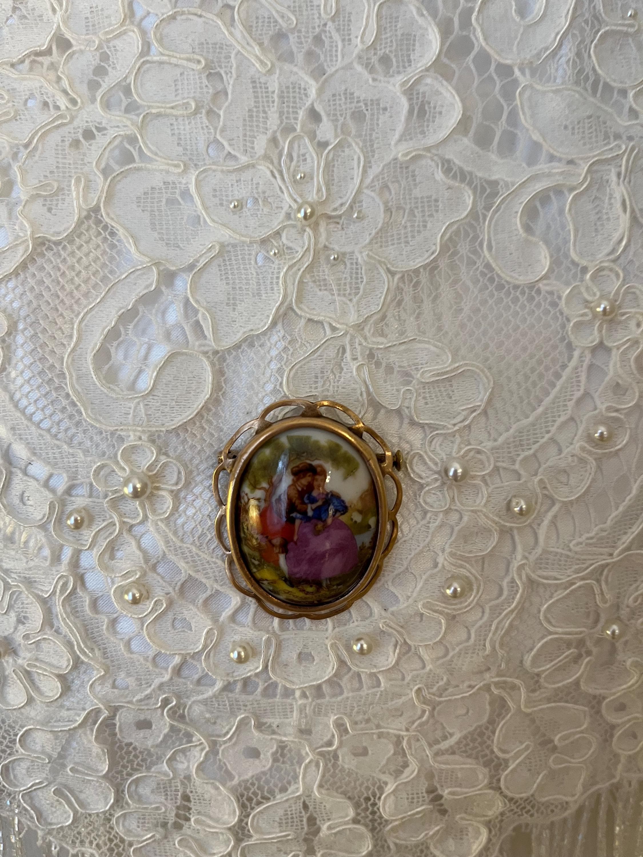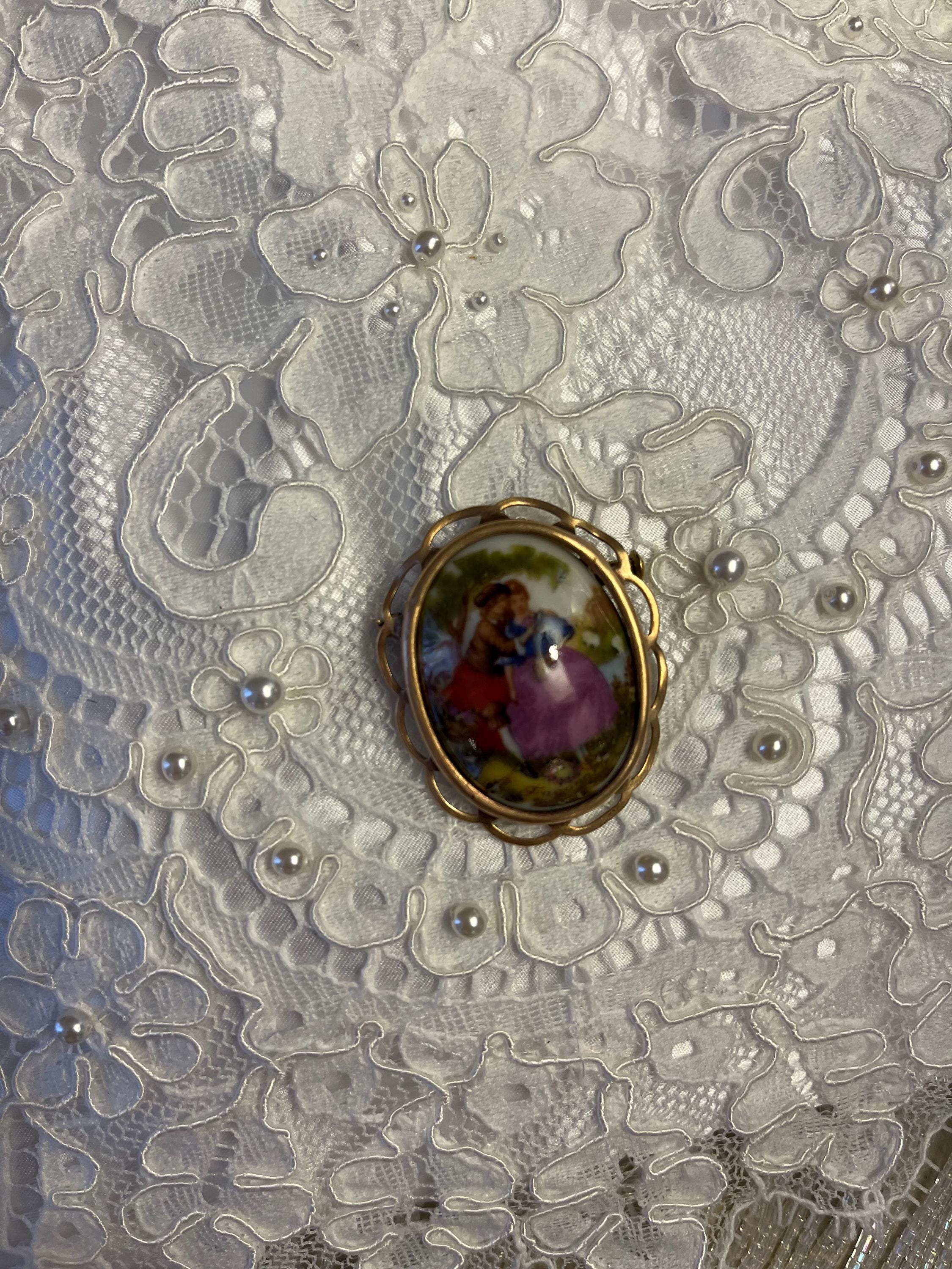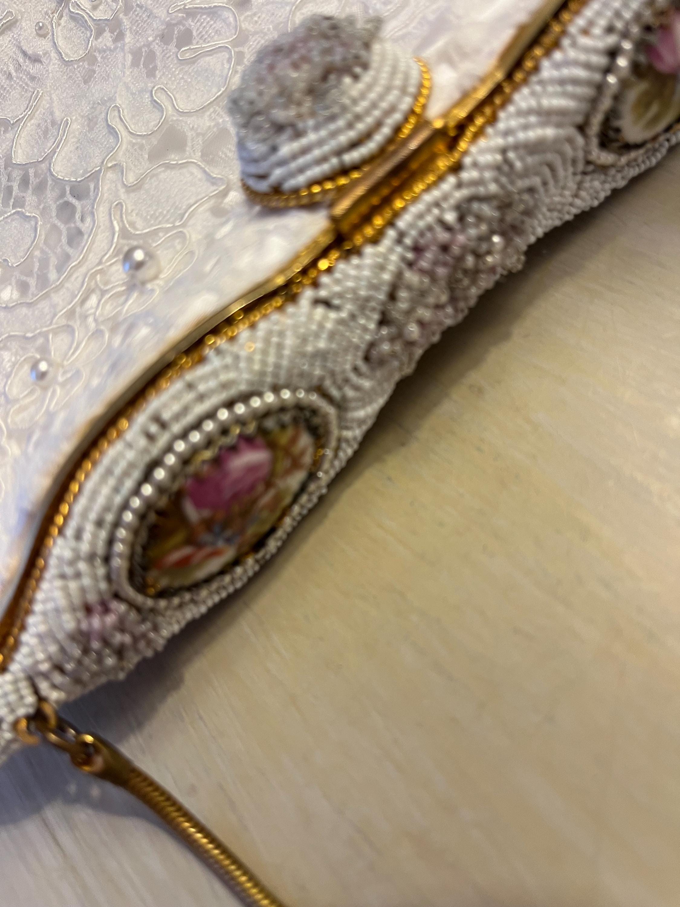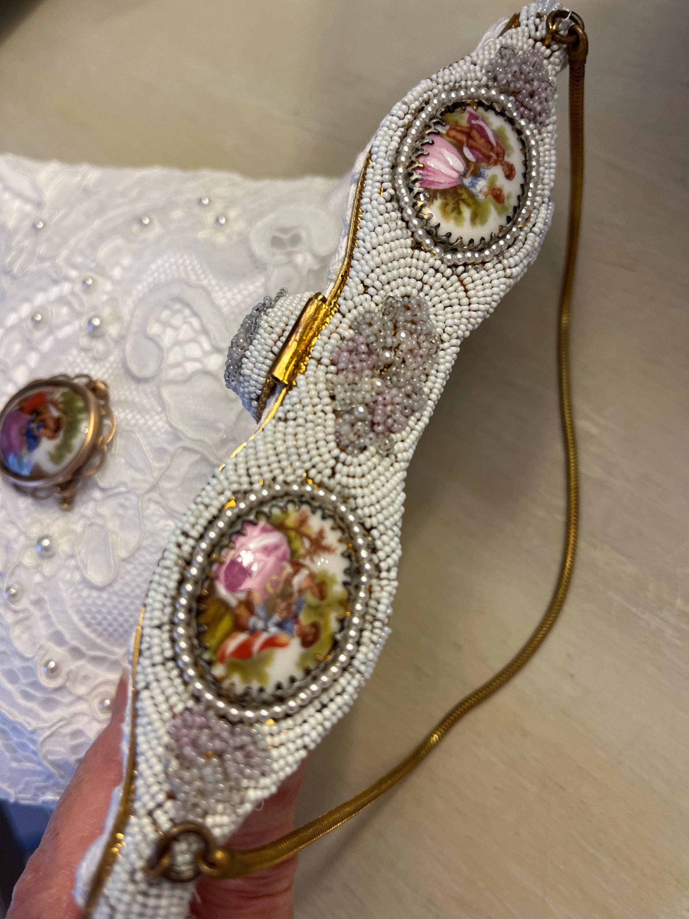 Beautiful antique purse frame c 1940 Intricate micro beading with Two Limoges Cameossurrounded by tiny white and gold beads The beading is exquisite and in perfect condition