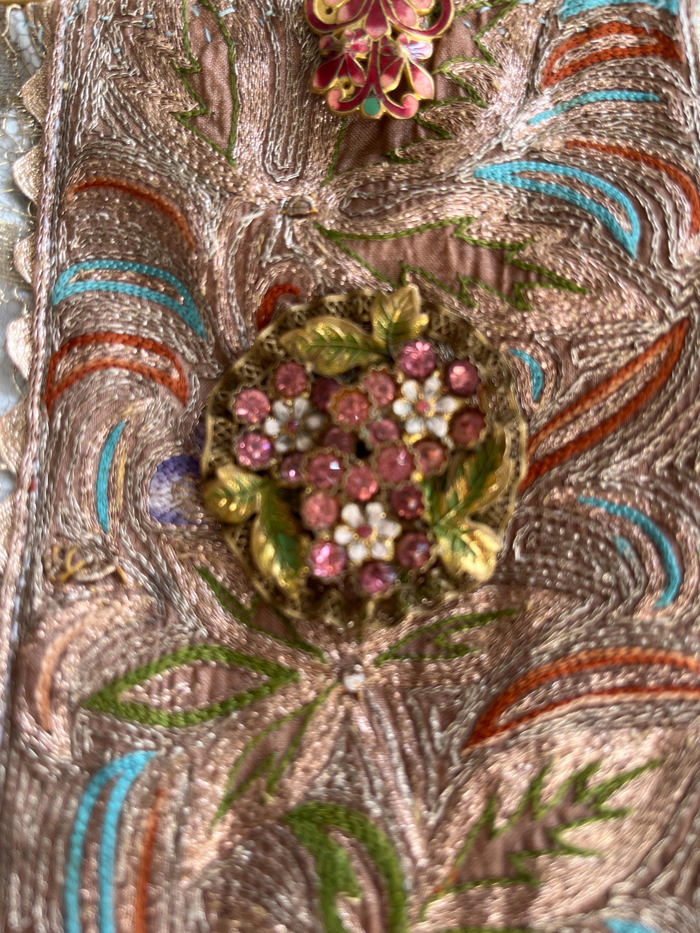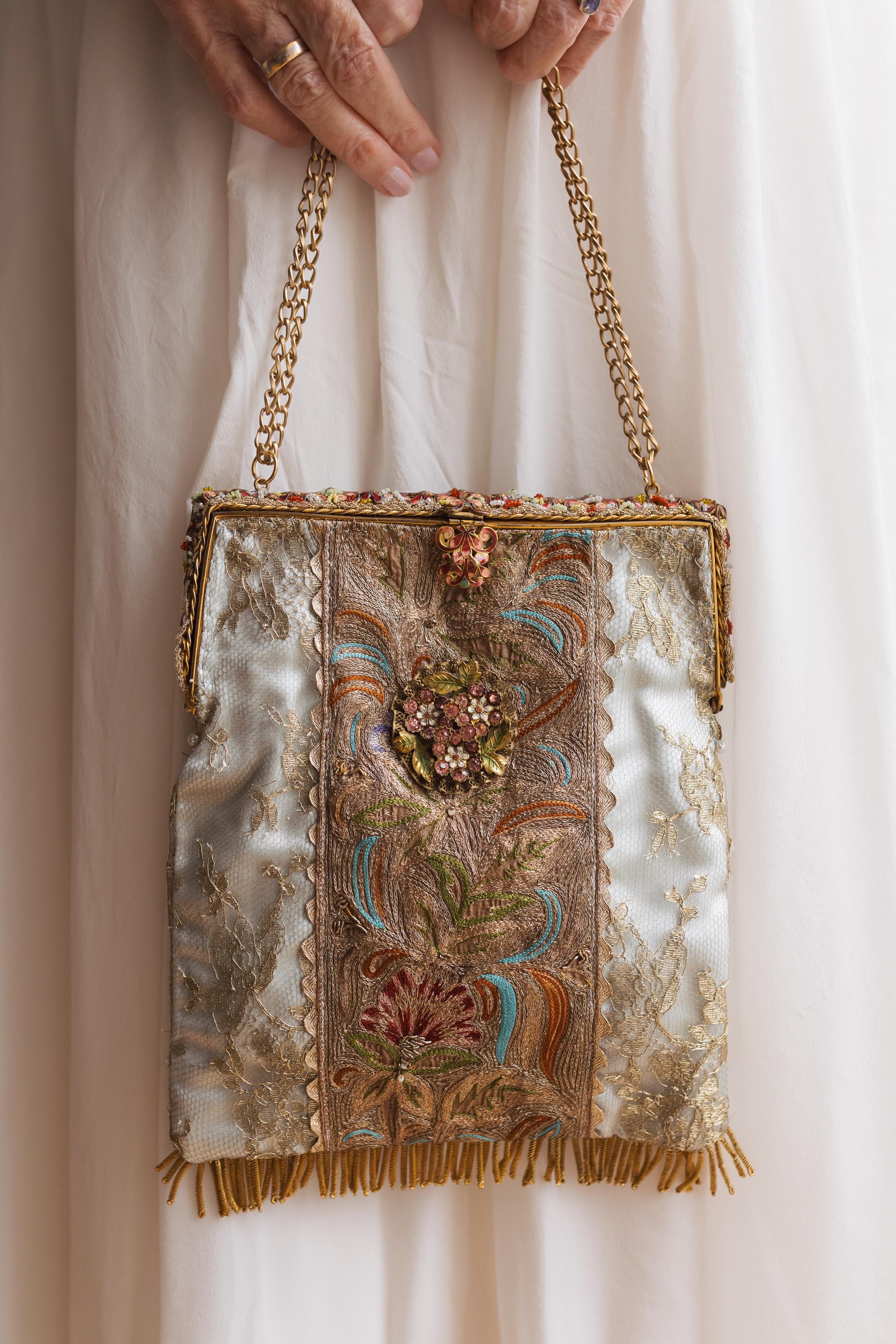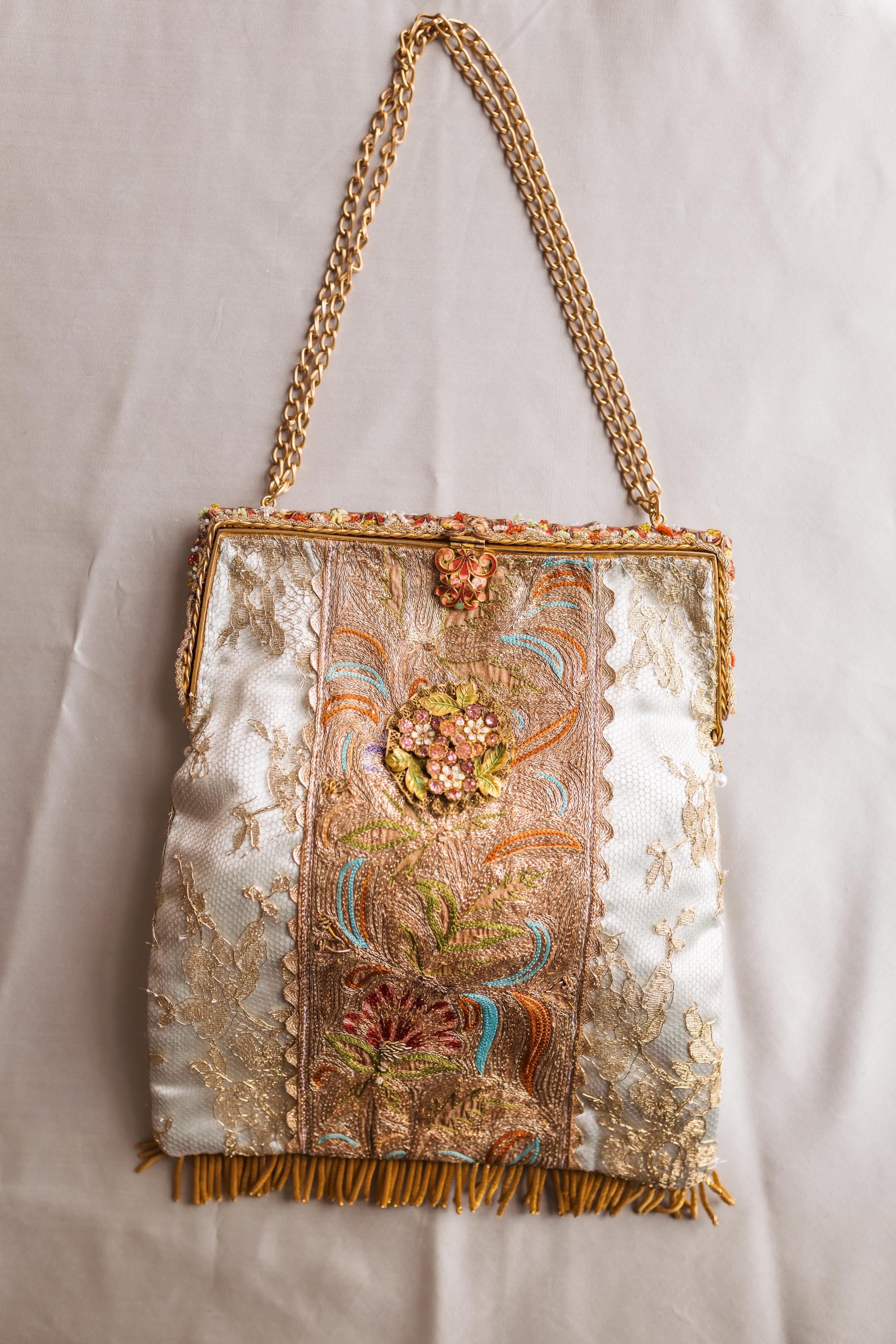 The bag itself is made in french gold lace and a panel of intricate embroidery running down the centre The embroidery is beautiful worked in silk and gold threads . Very fine it is Antique probably from the far East but I found it in an antique Textile fair in London . . Both sides are similar .