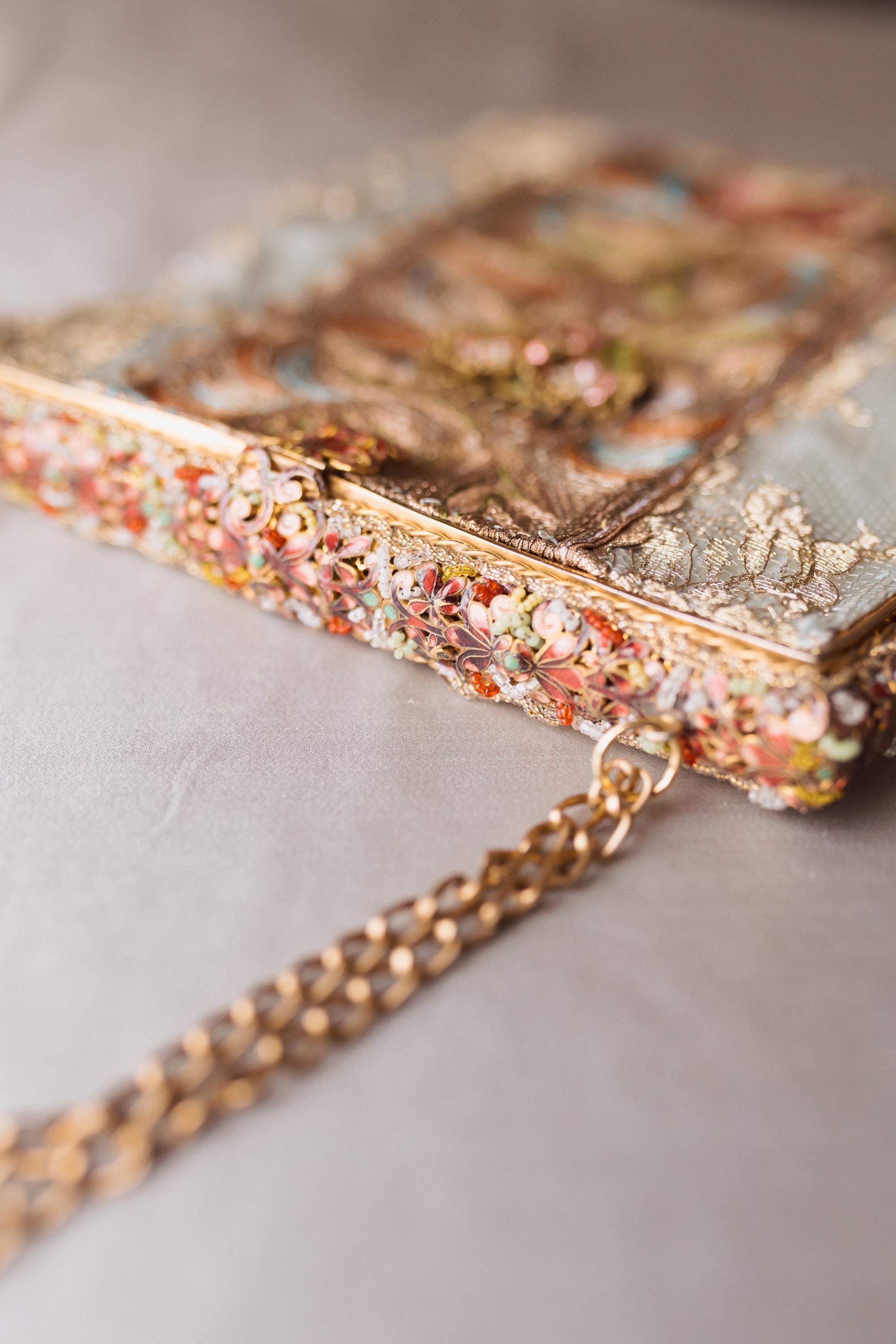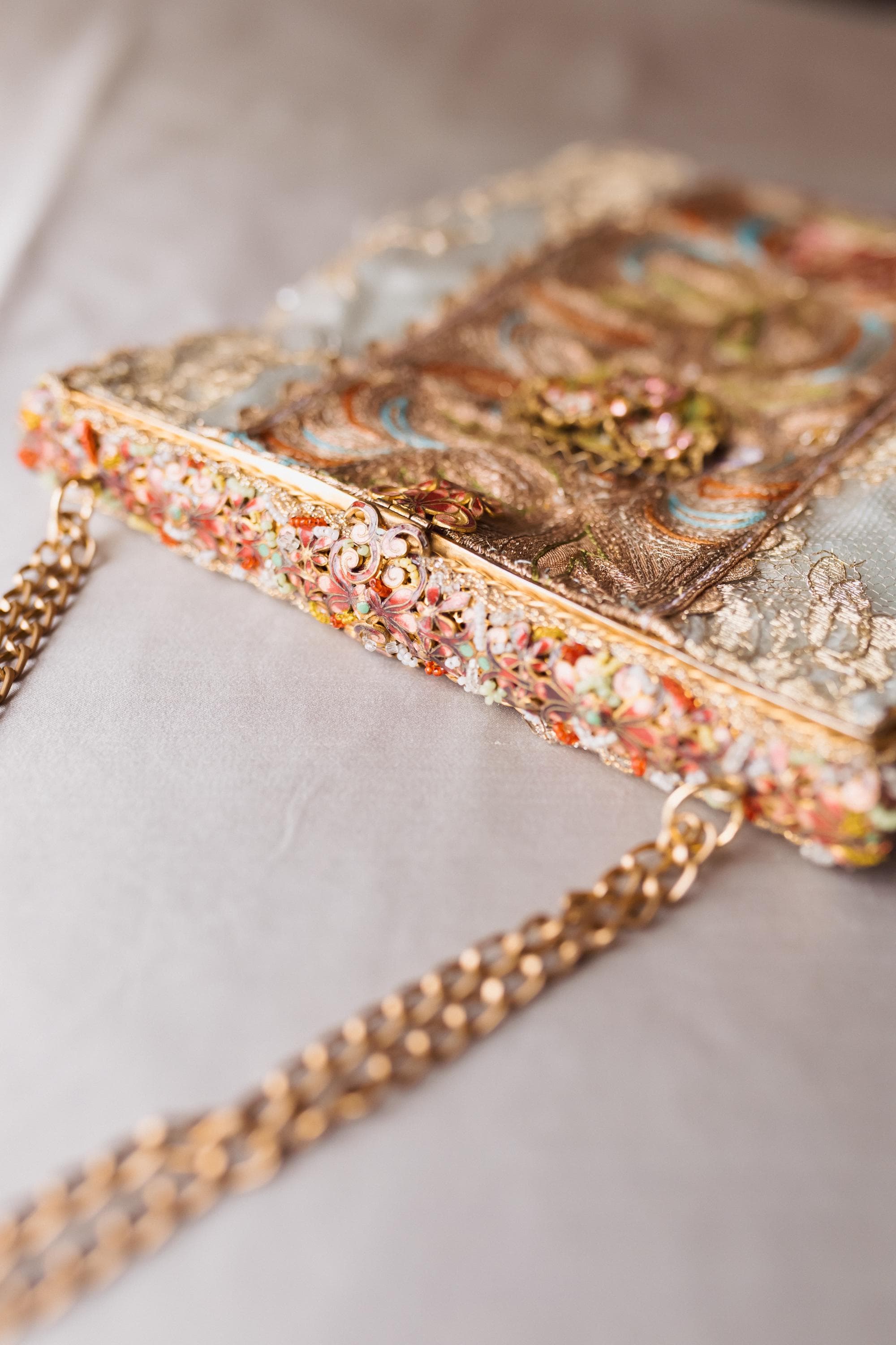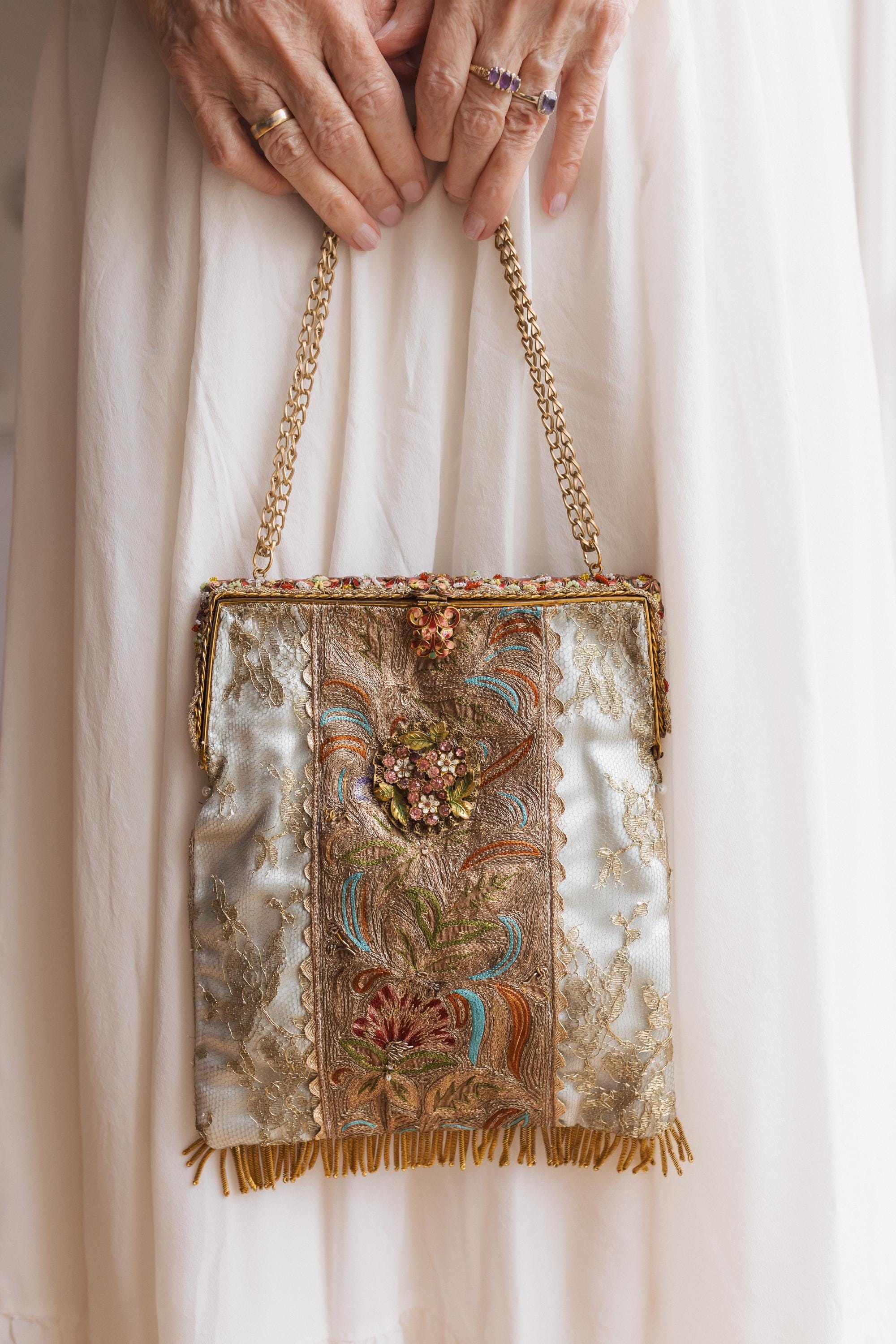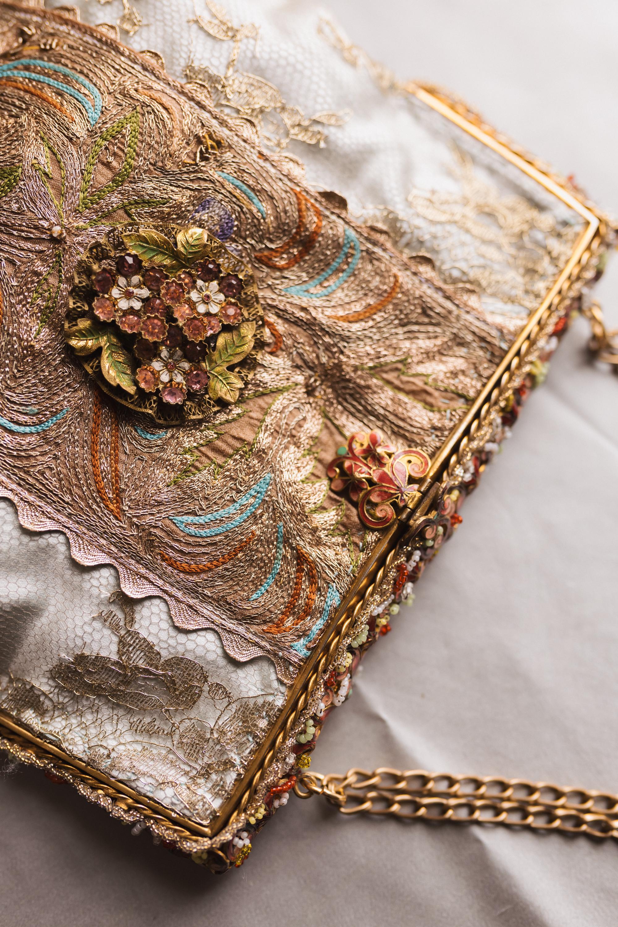 The bag itself is made in french gold lace and a panel of intricate embroidery running down the centre The embroidery is beautiful worked in silk and gold threads . Very fine it is Antique probably from the far East but I found it in an antique Textile fair in London . . Both sides are similar .