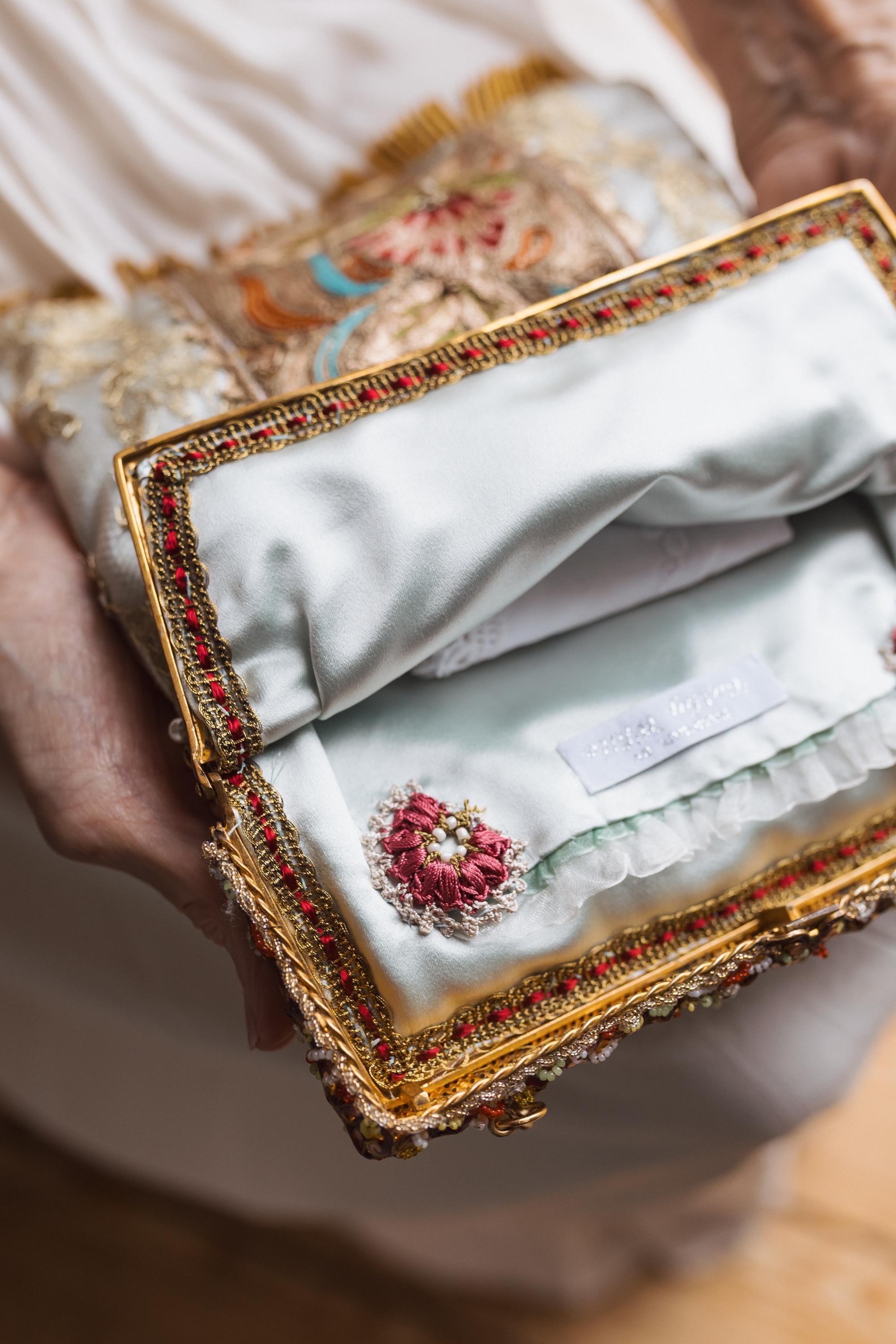 The inside of the bag is lined in matching silk and decorated with vintage ribbon and hand crochet flowers sourced from Turkey