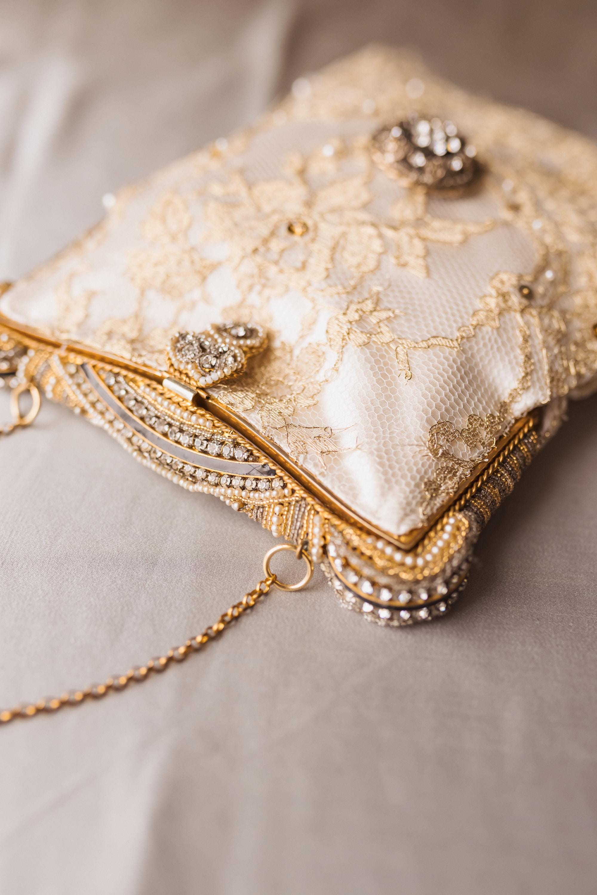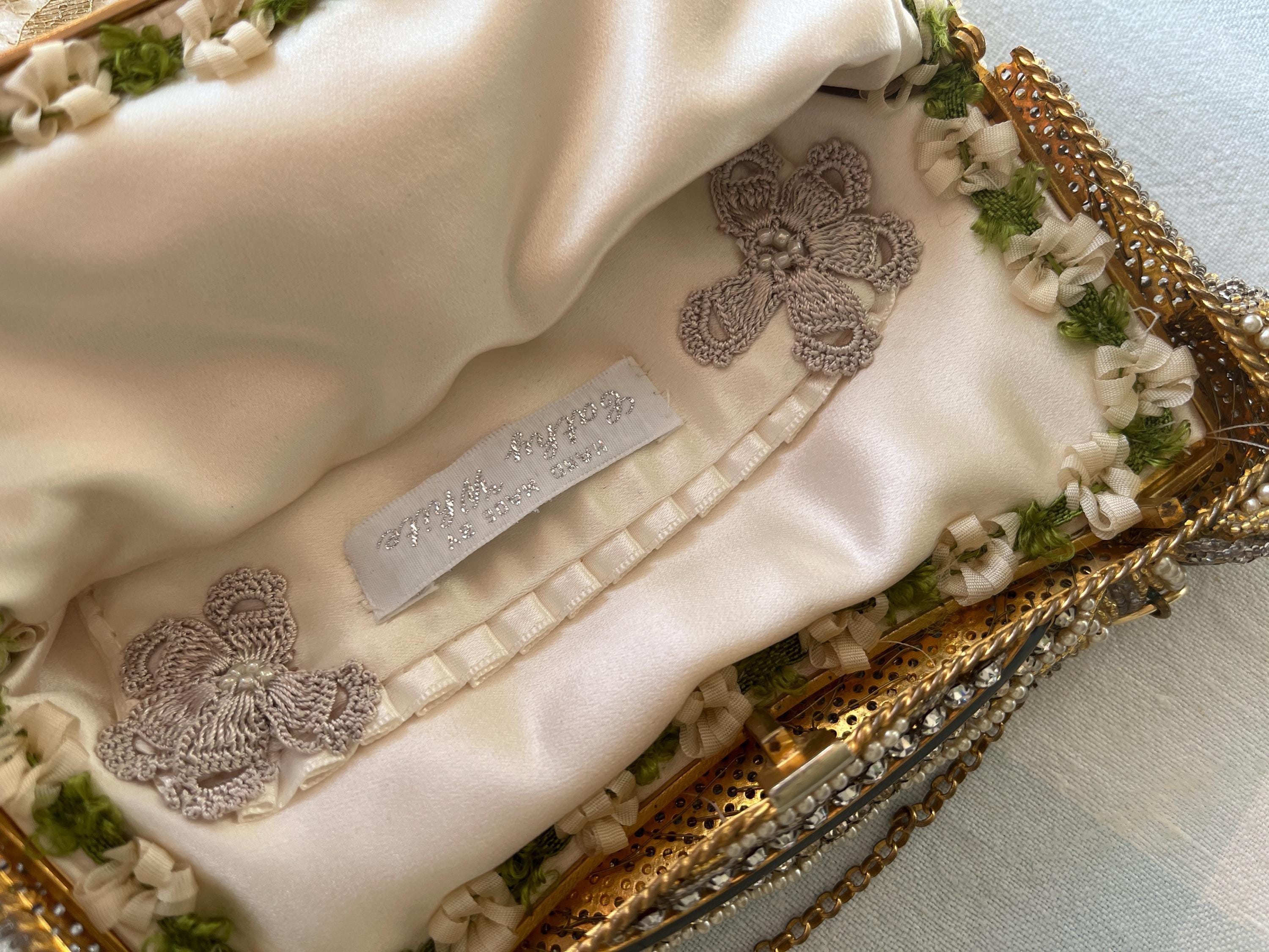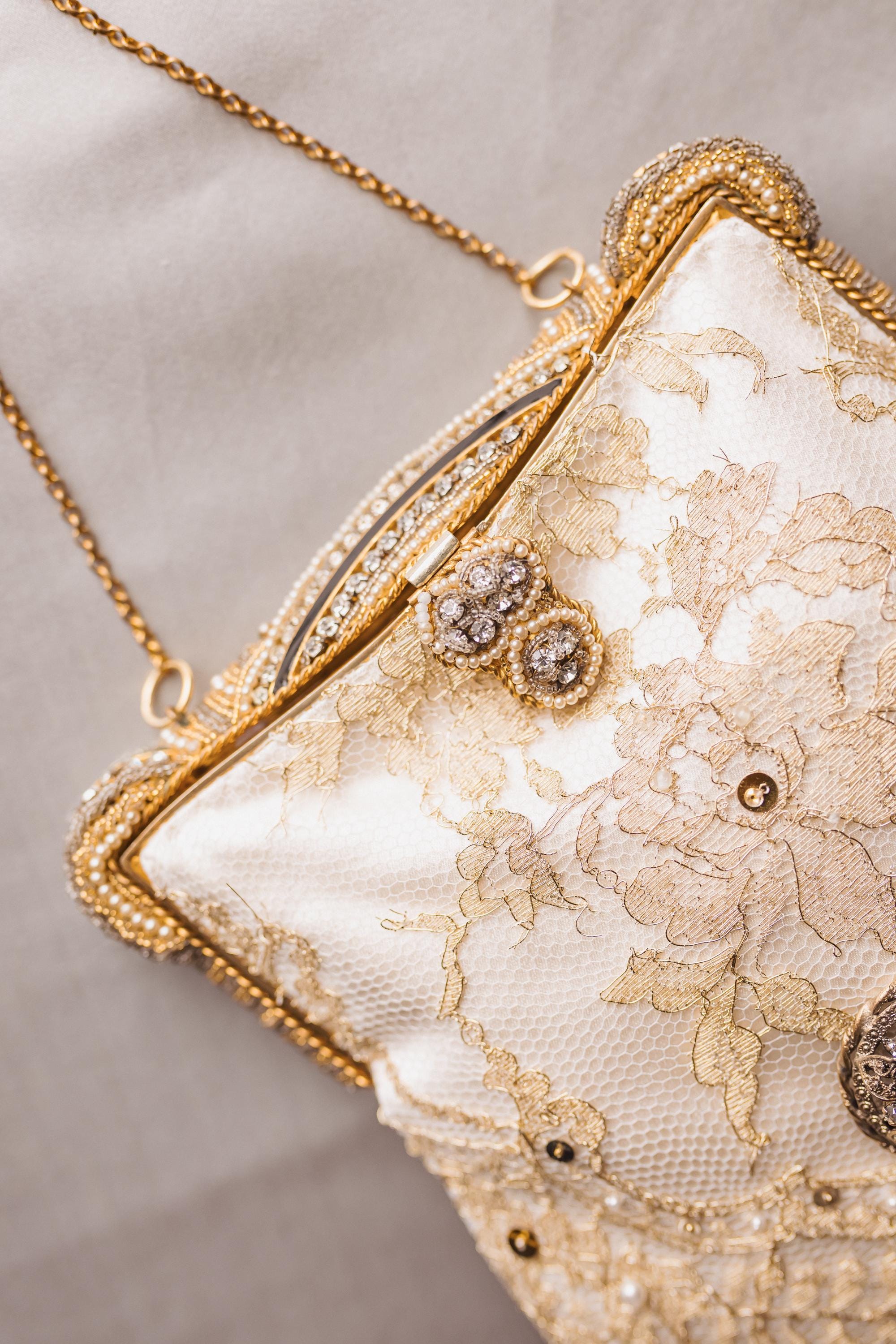The bag has been remade in hand beaded french gold lace stretched over cream pure silk .