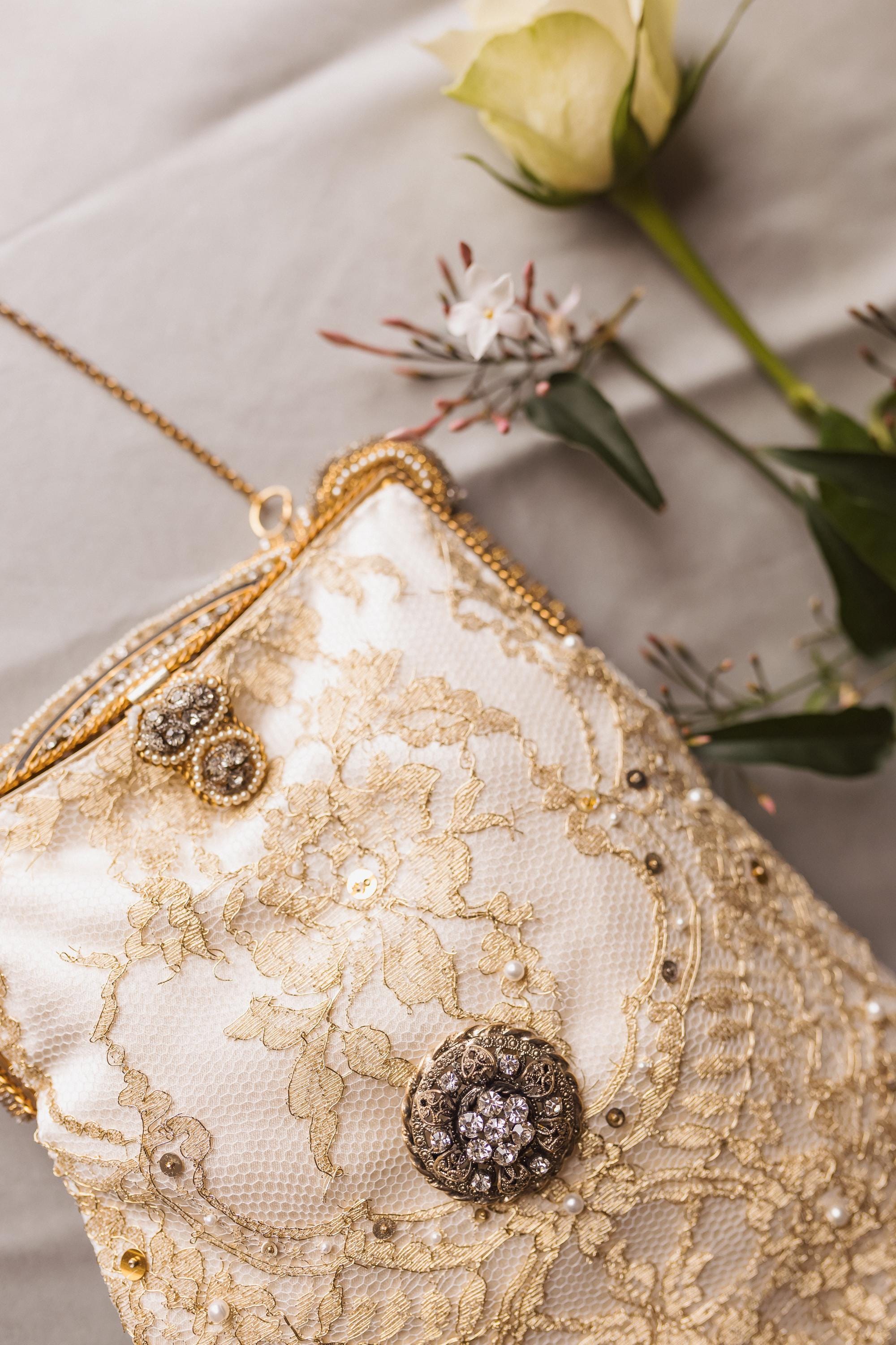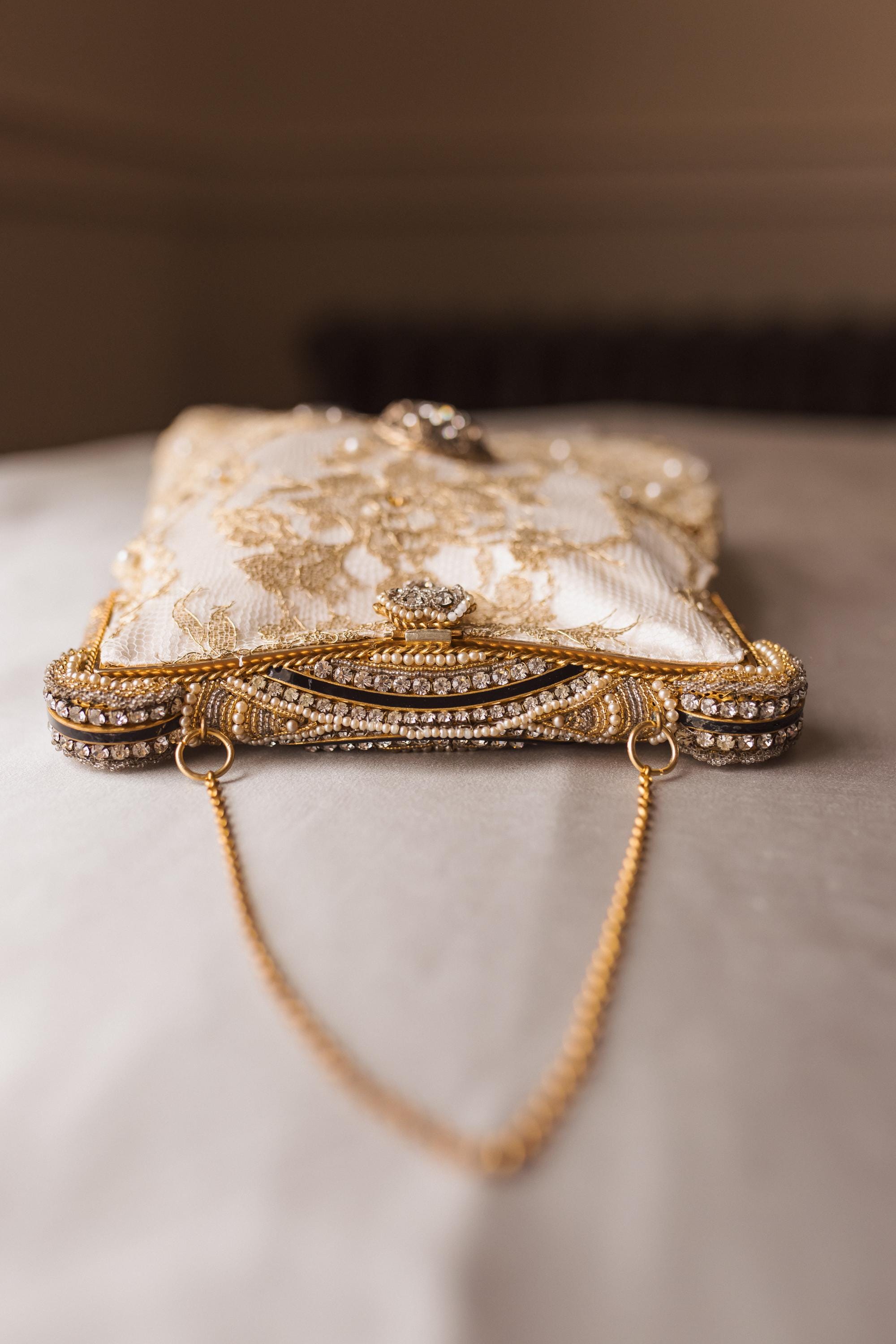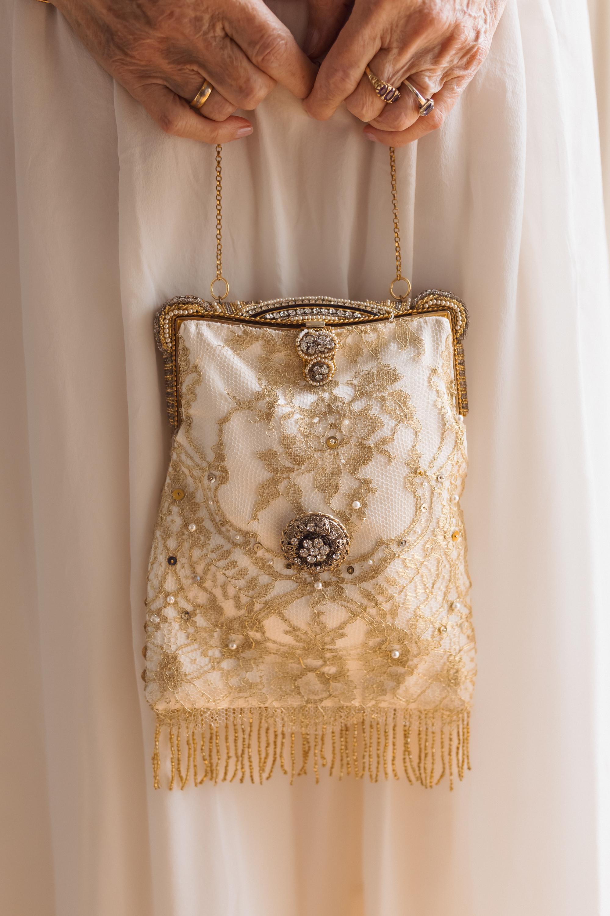 The bag has been remade in hand beaded french gold lace stretched over cream pure silk .