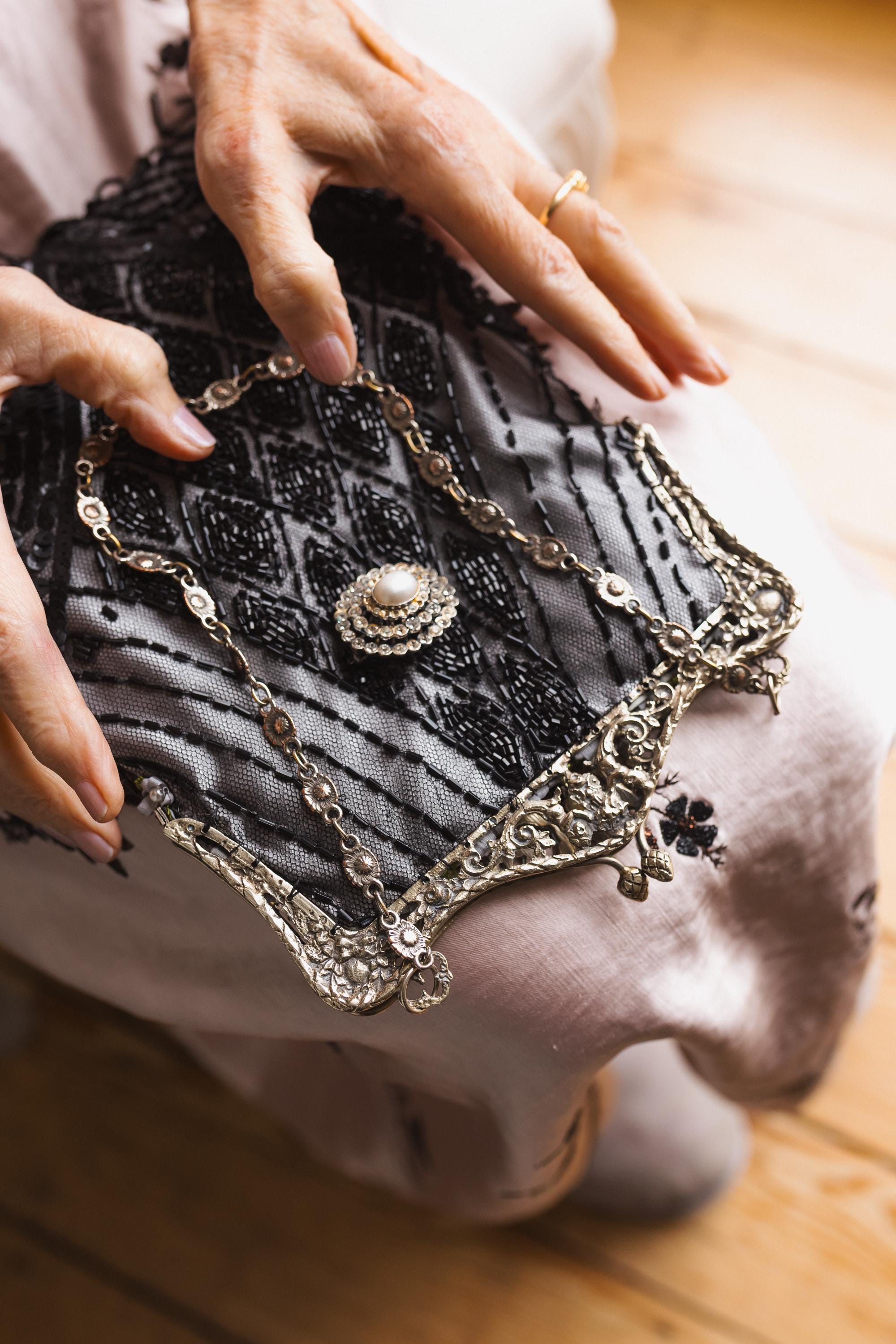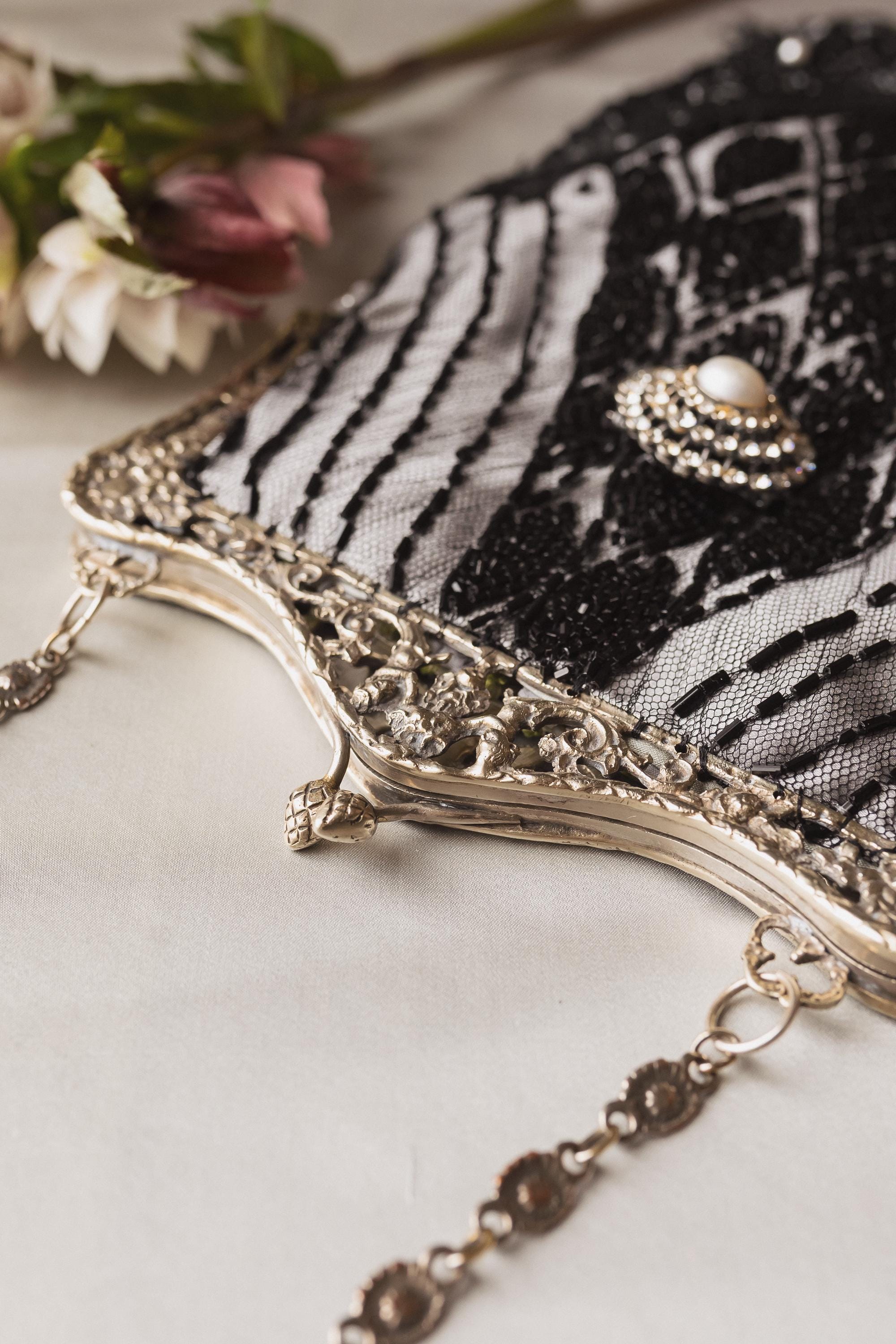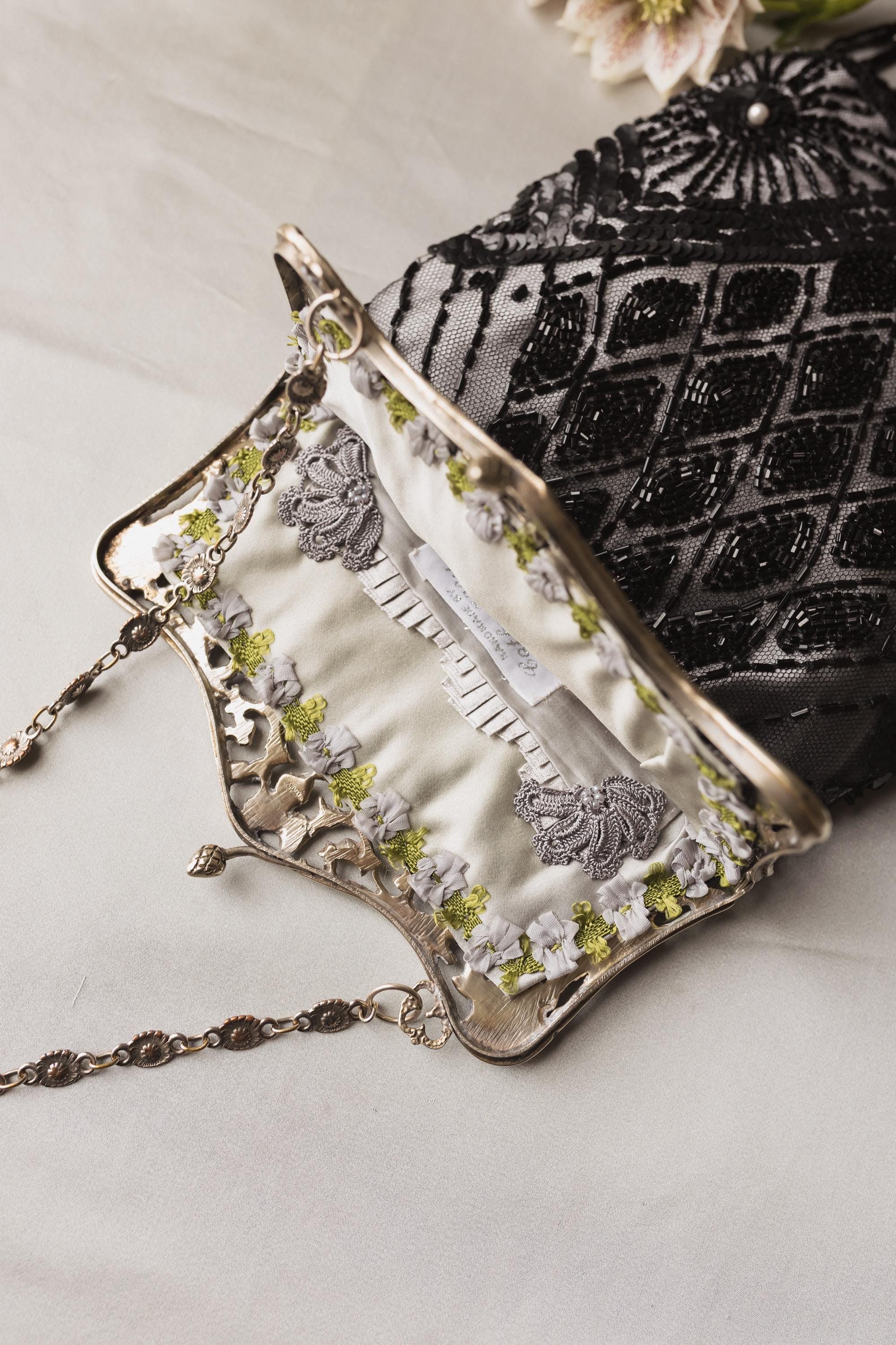 Hand made in Ireland using vintage lace and an Antique silver purse frame .
