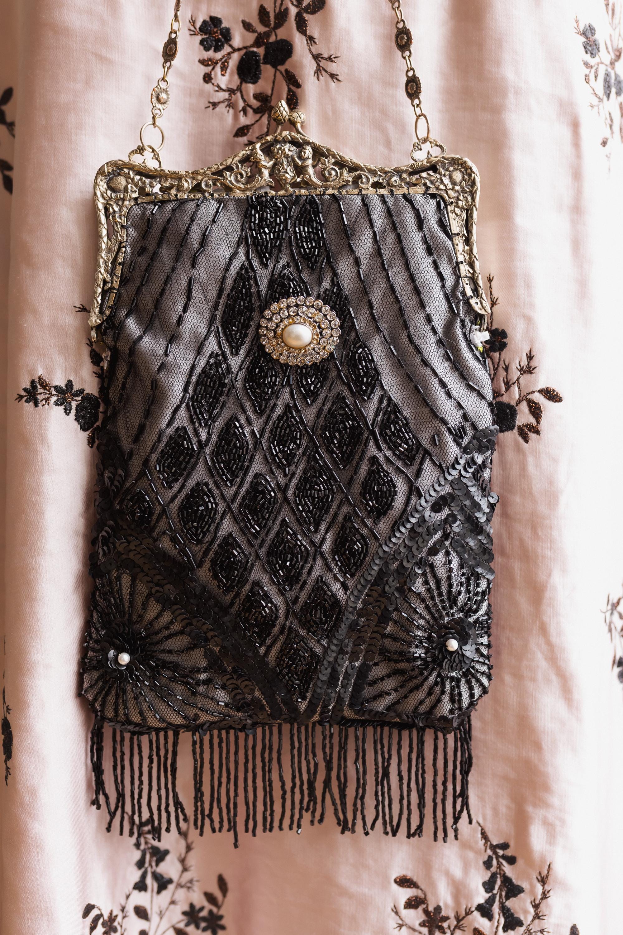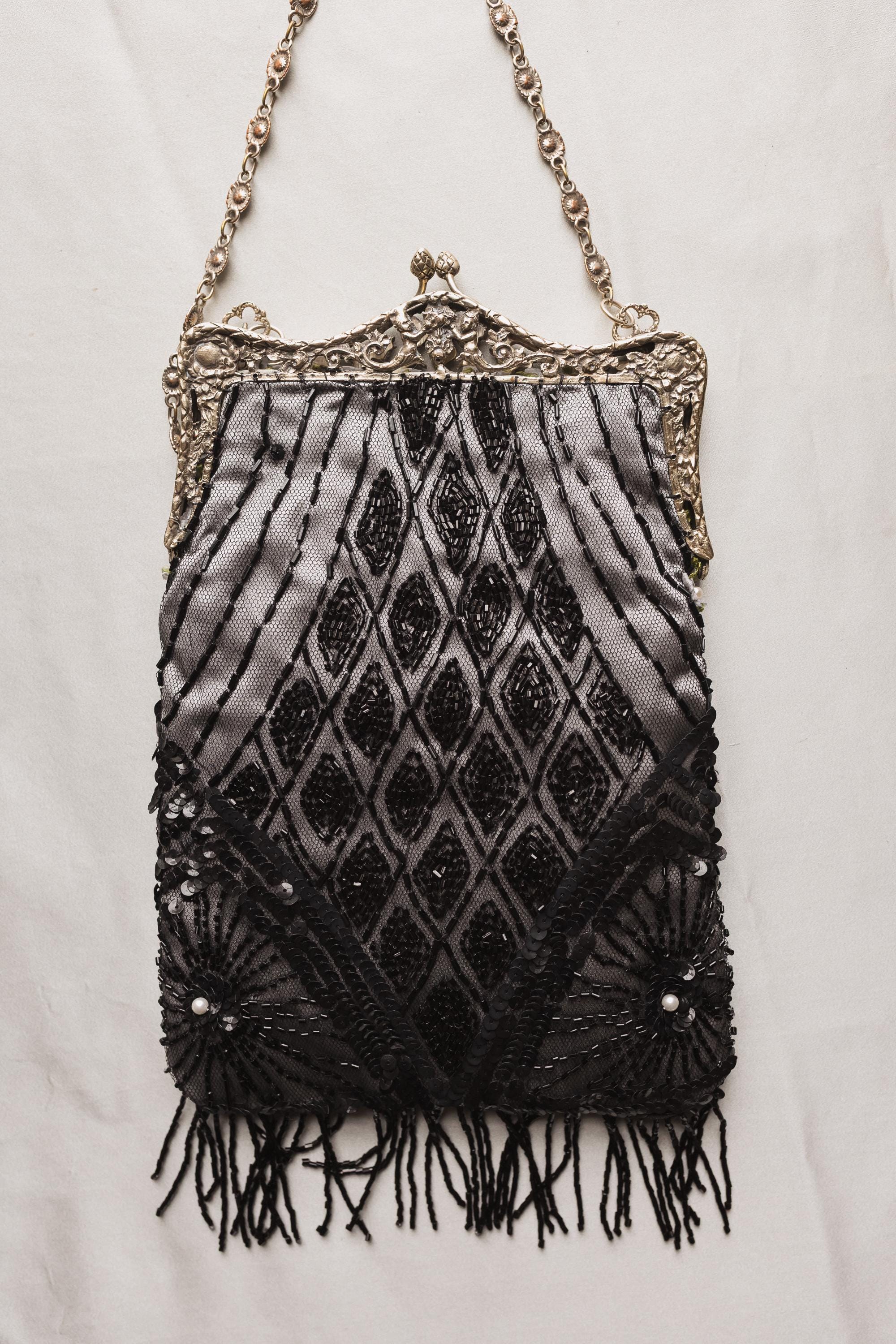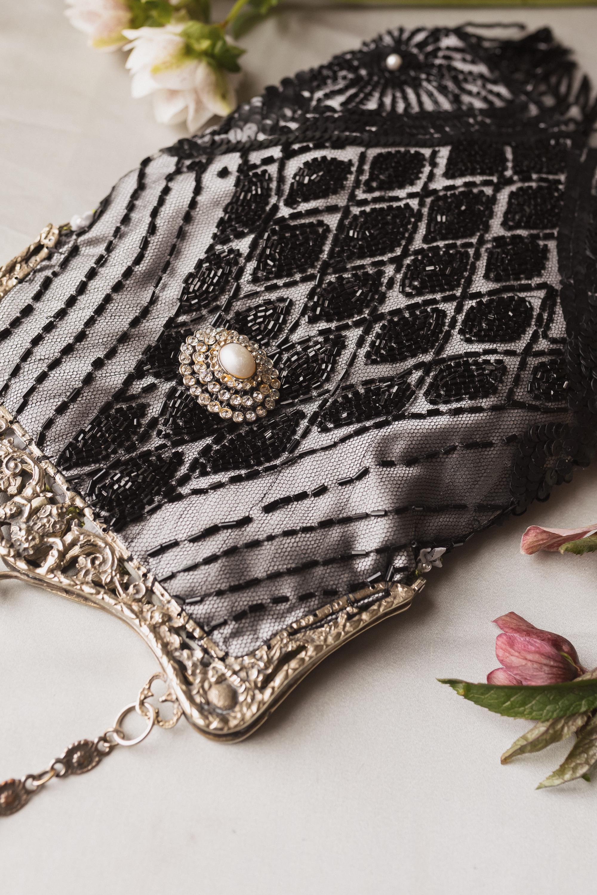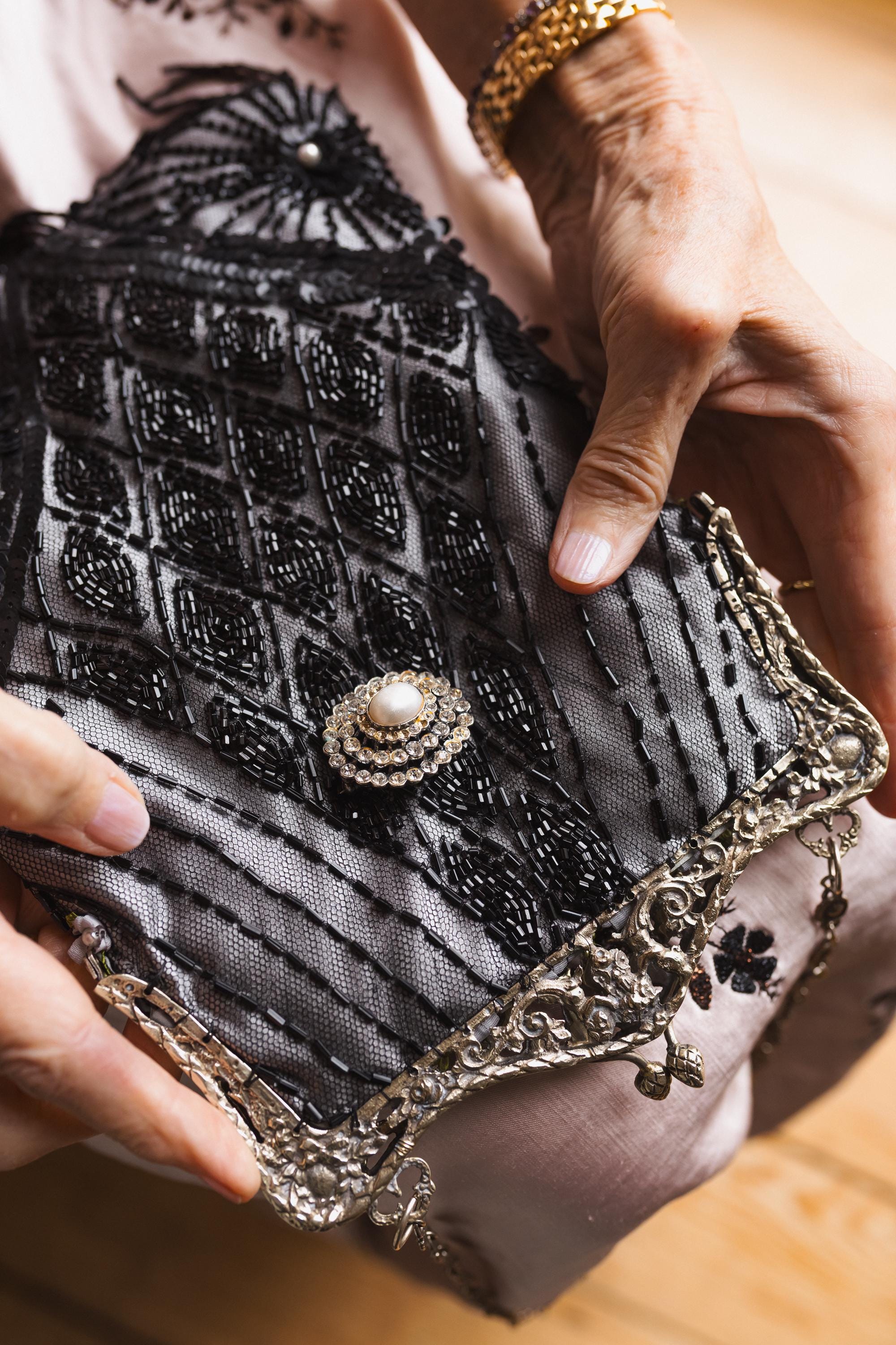beaded lace salvaged from an antique dress stretched over silver Duchess silk. . This beading is Antique and delicate and not suited for heavy items . The beading is extremely delicate and I have hand sewn it to the silk to secure it.