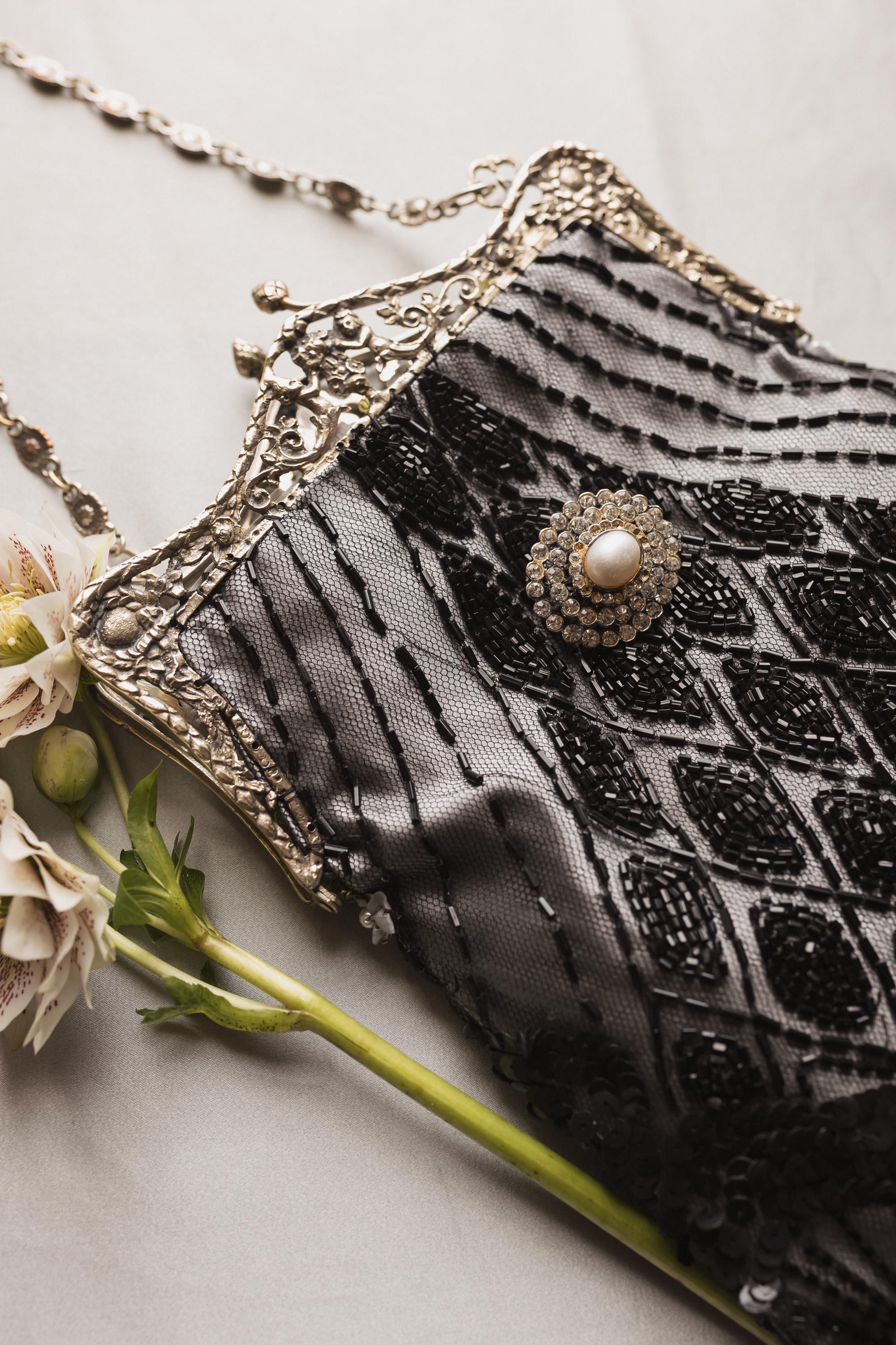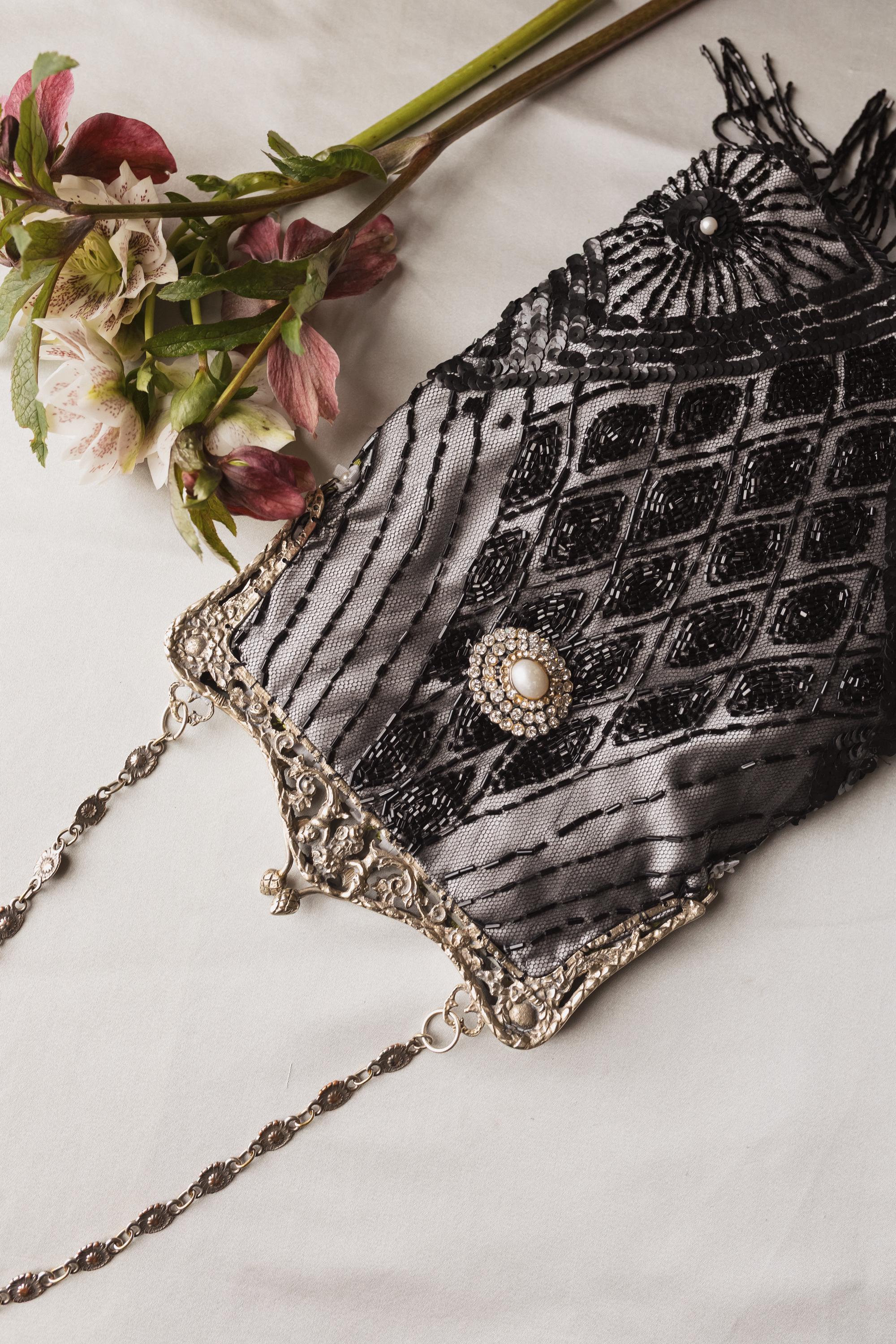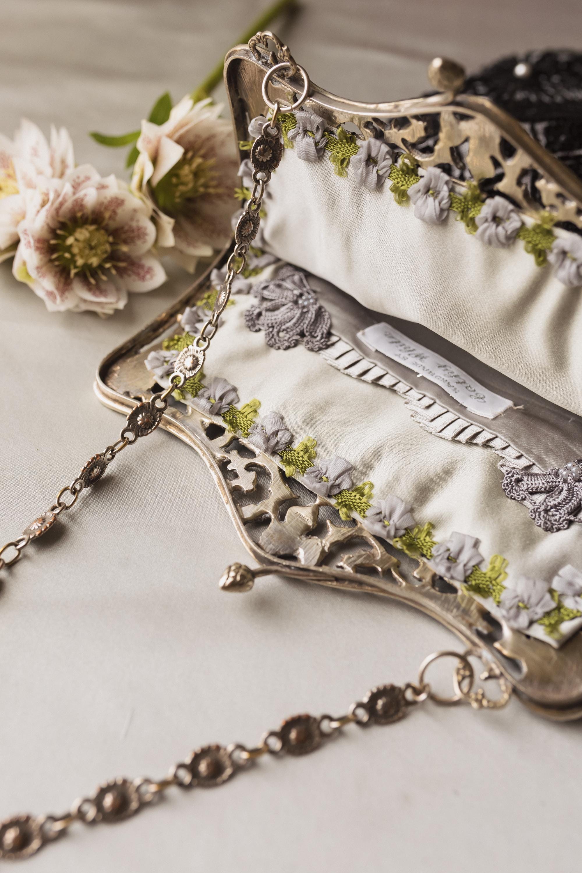 The inside of the bag is lined in matching silk and decorated with vintage ribbon and crochet flowers.