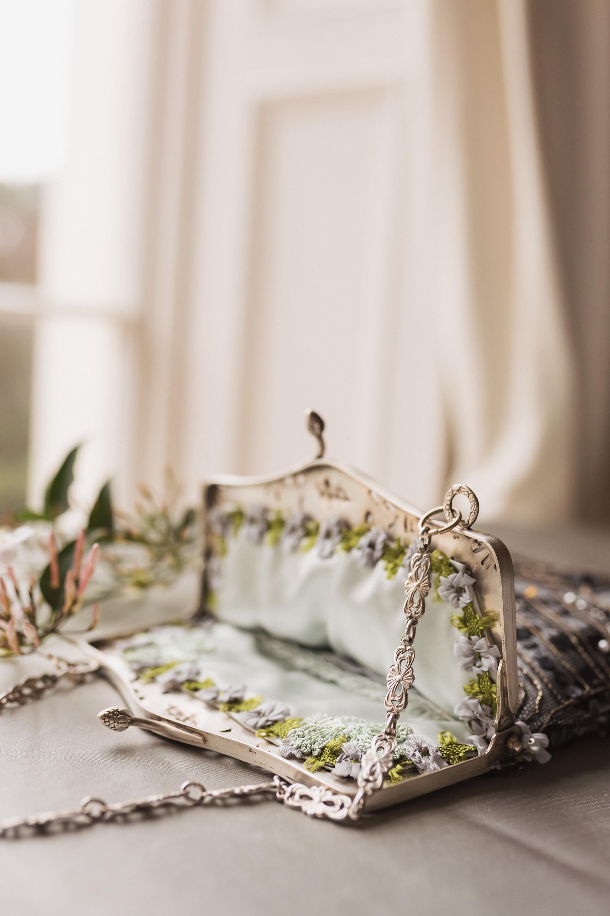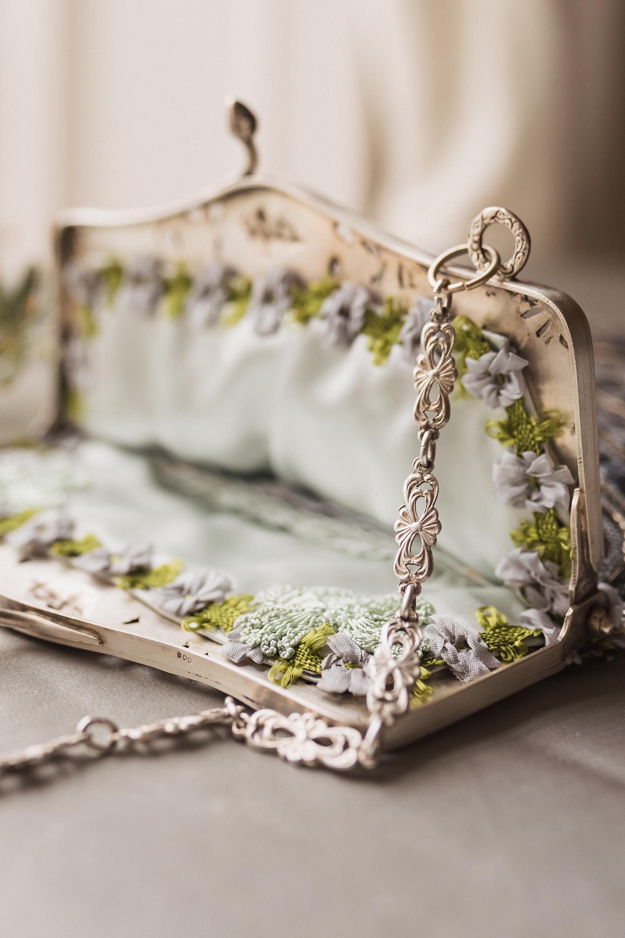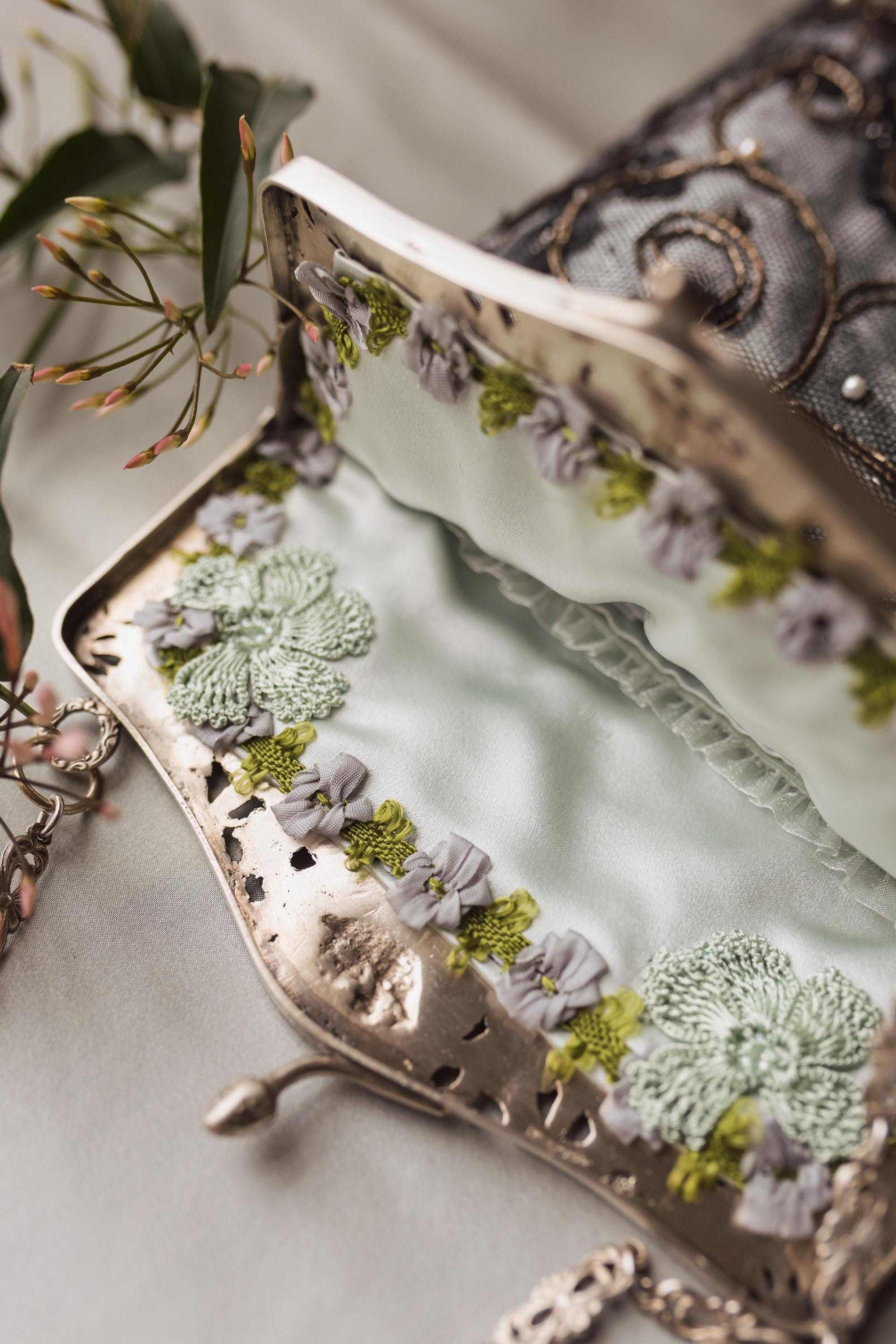 The inside of the bag is lined in matching silk and decorated with vintage ribbon and crochet flowers.