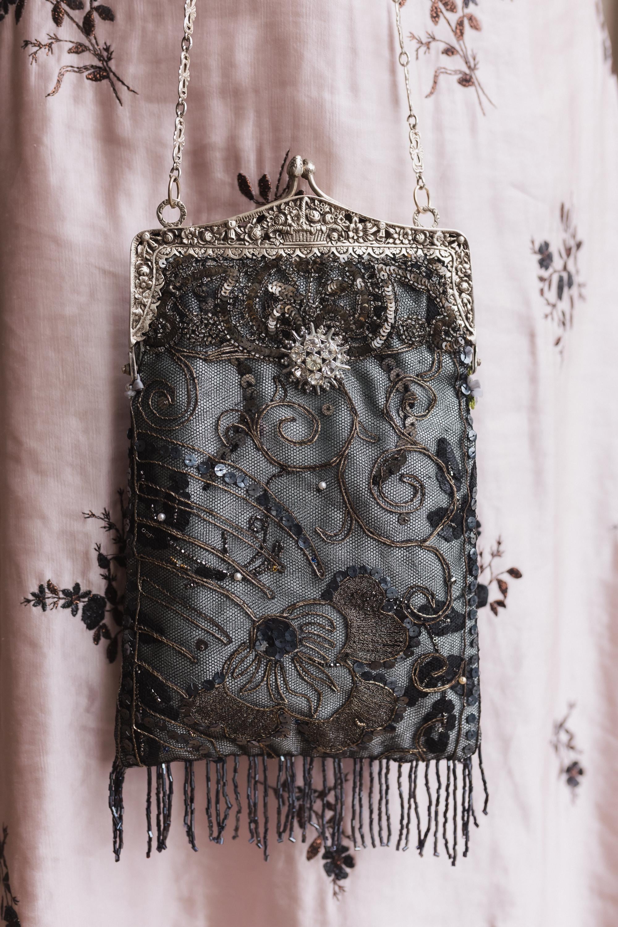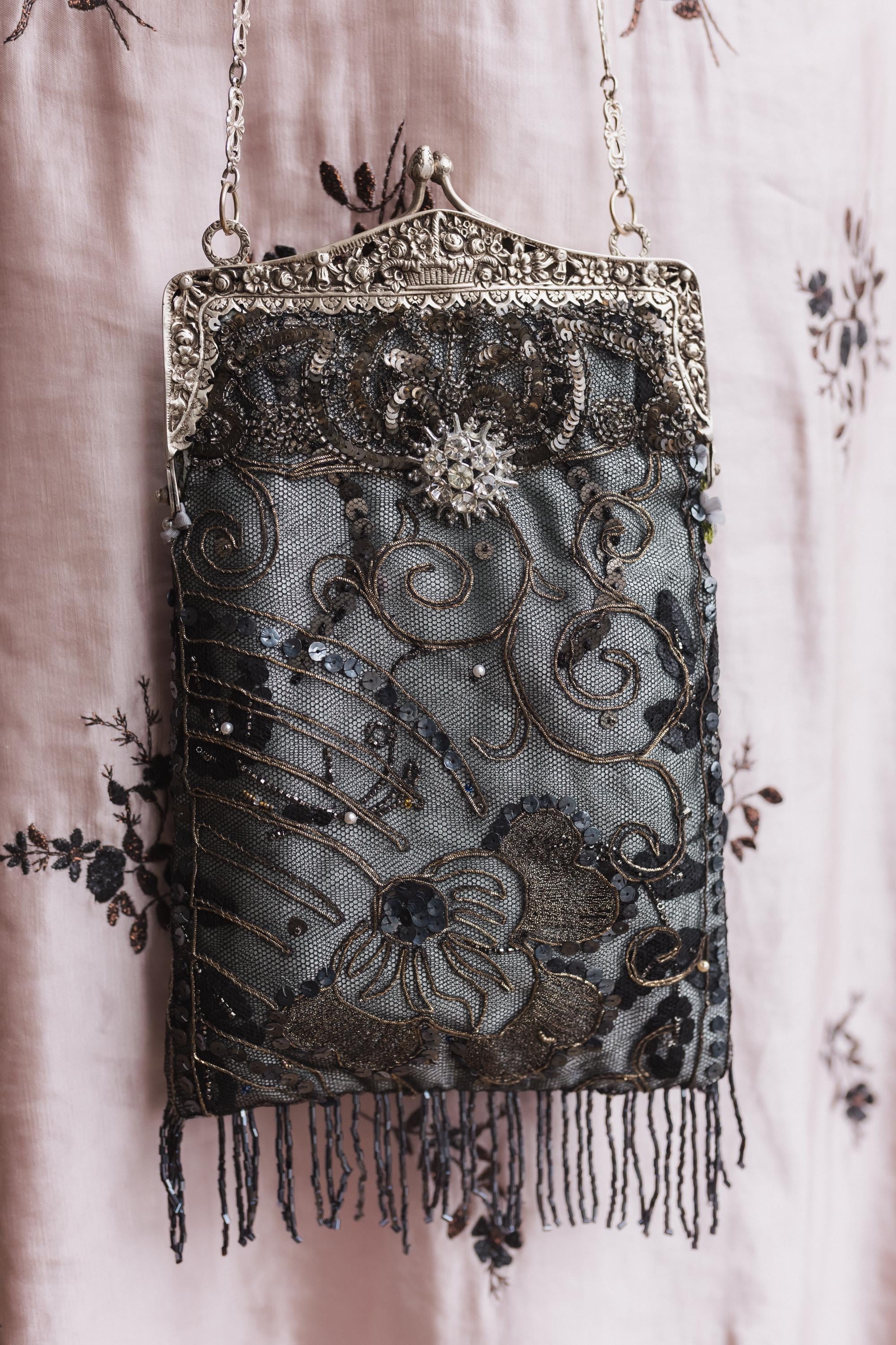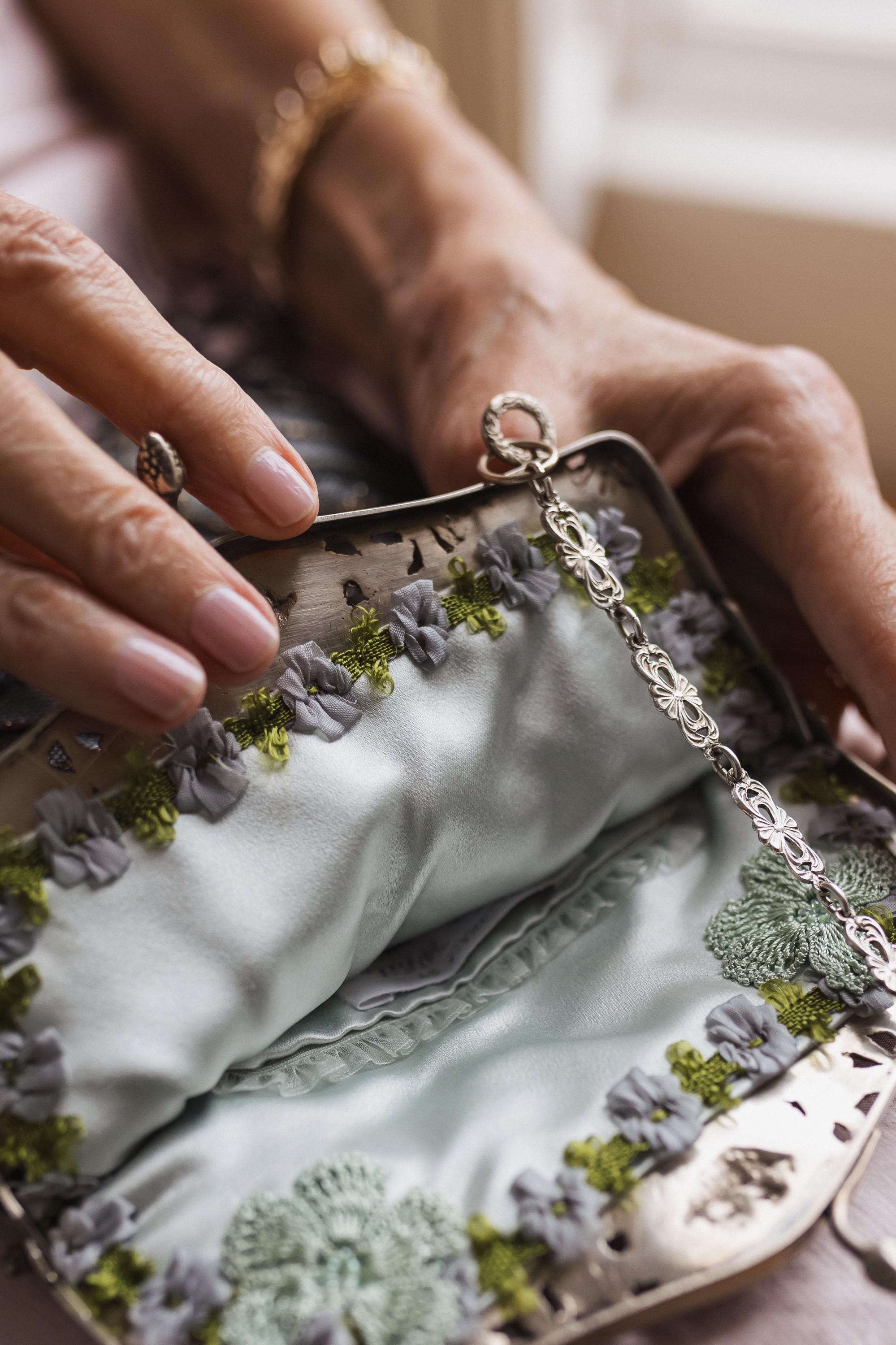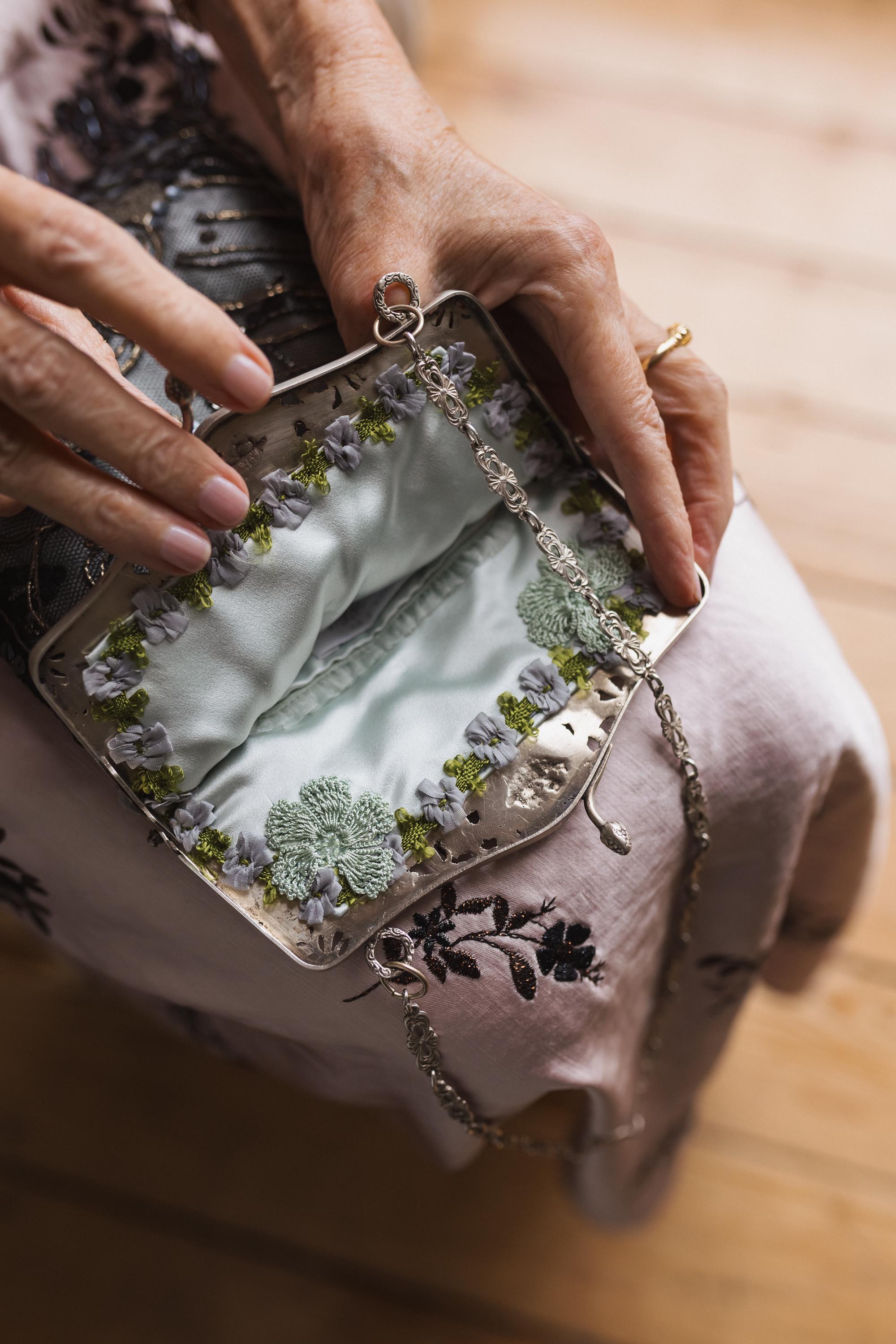 The inside of the bag is lined in matching silk and decorated with vintage ribbon and crochet flowers.