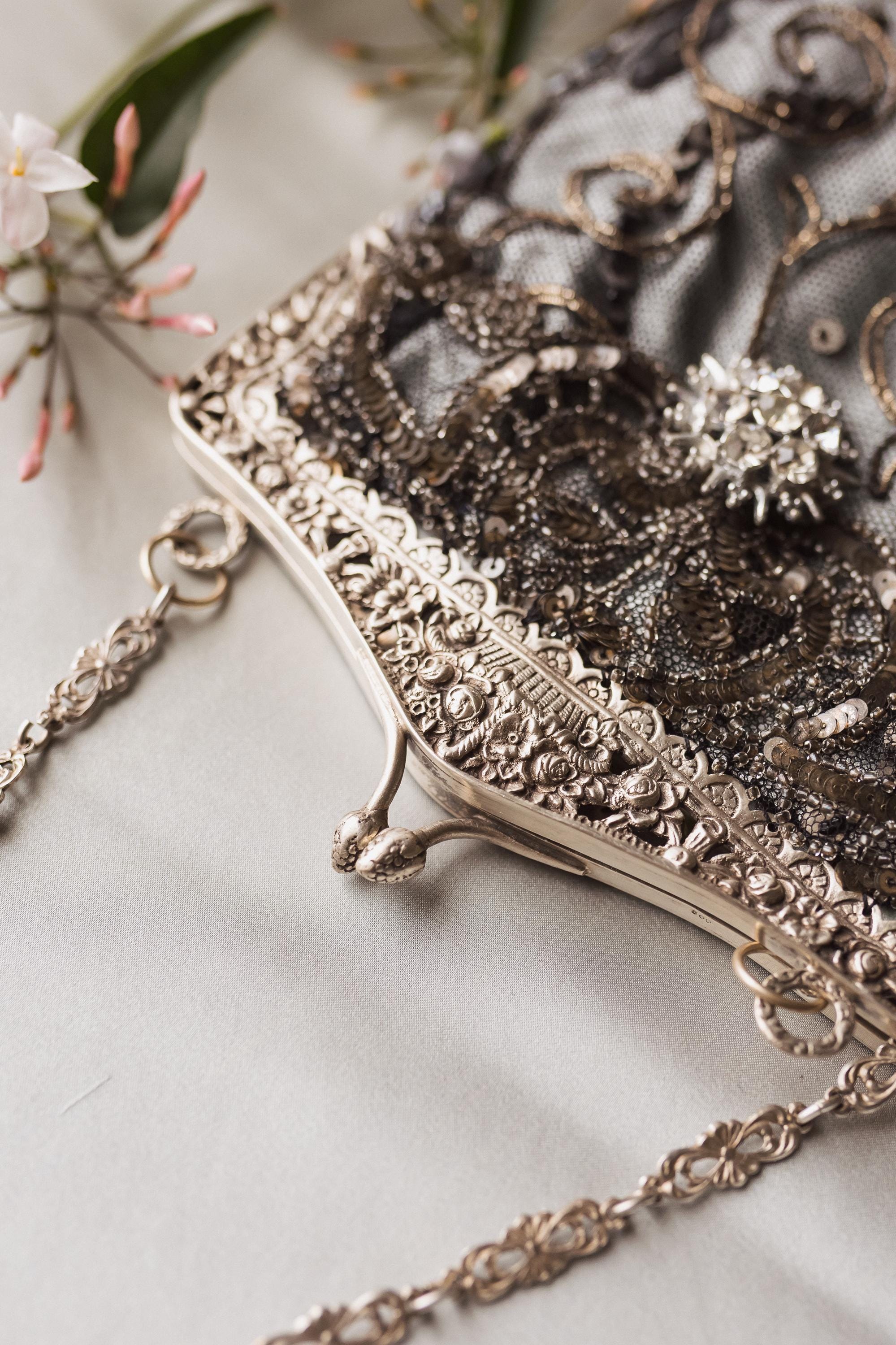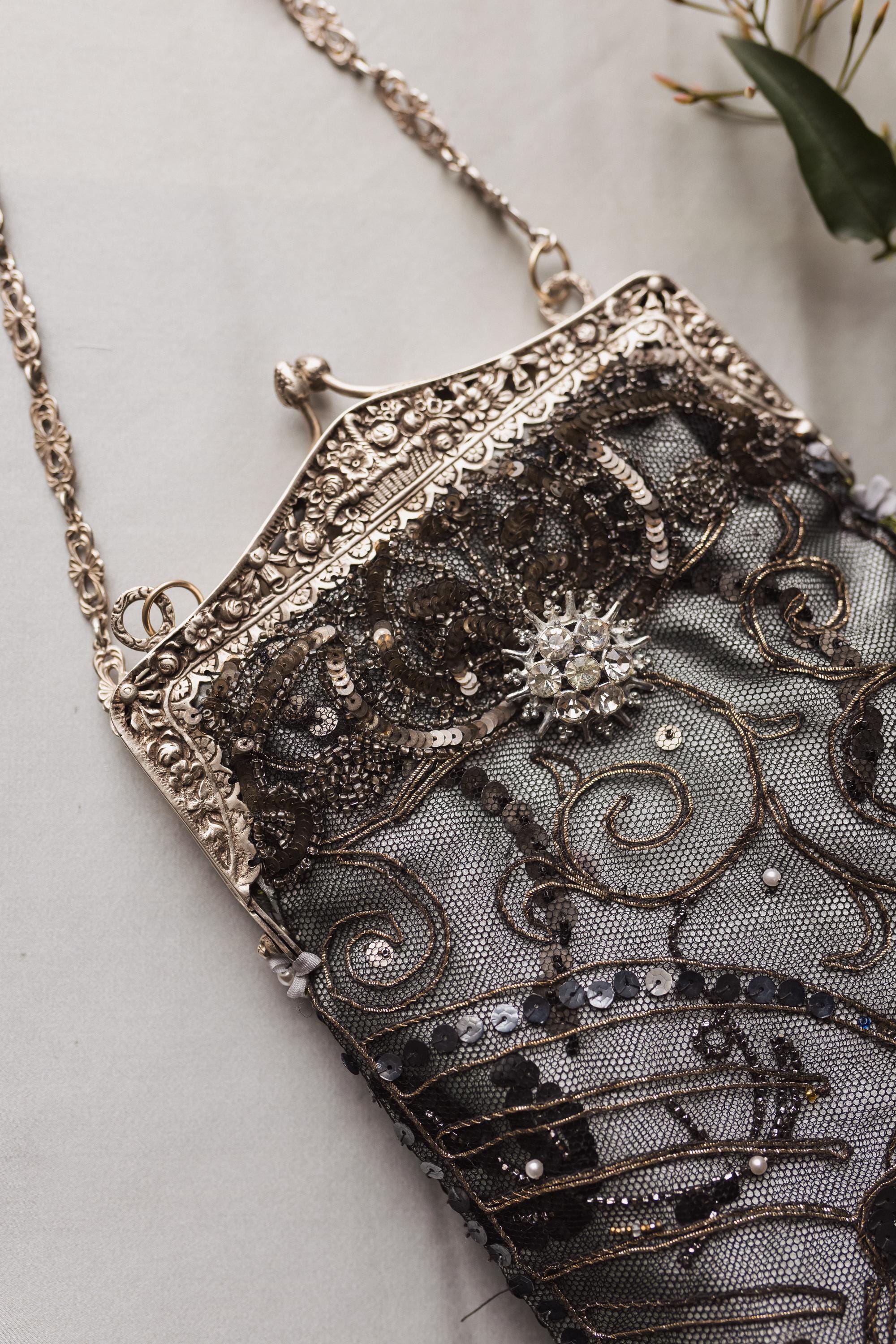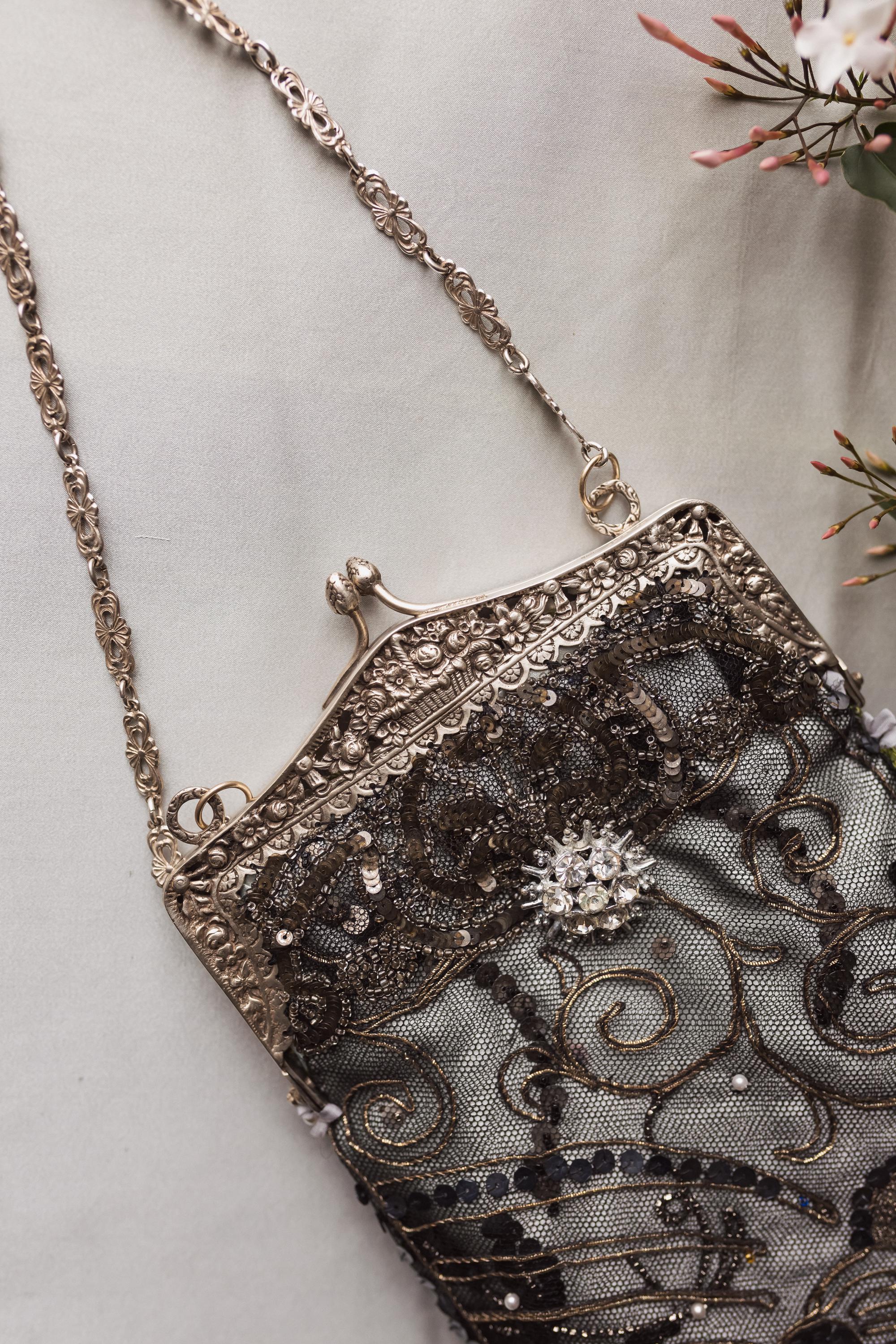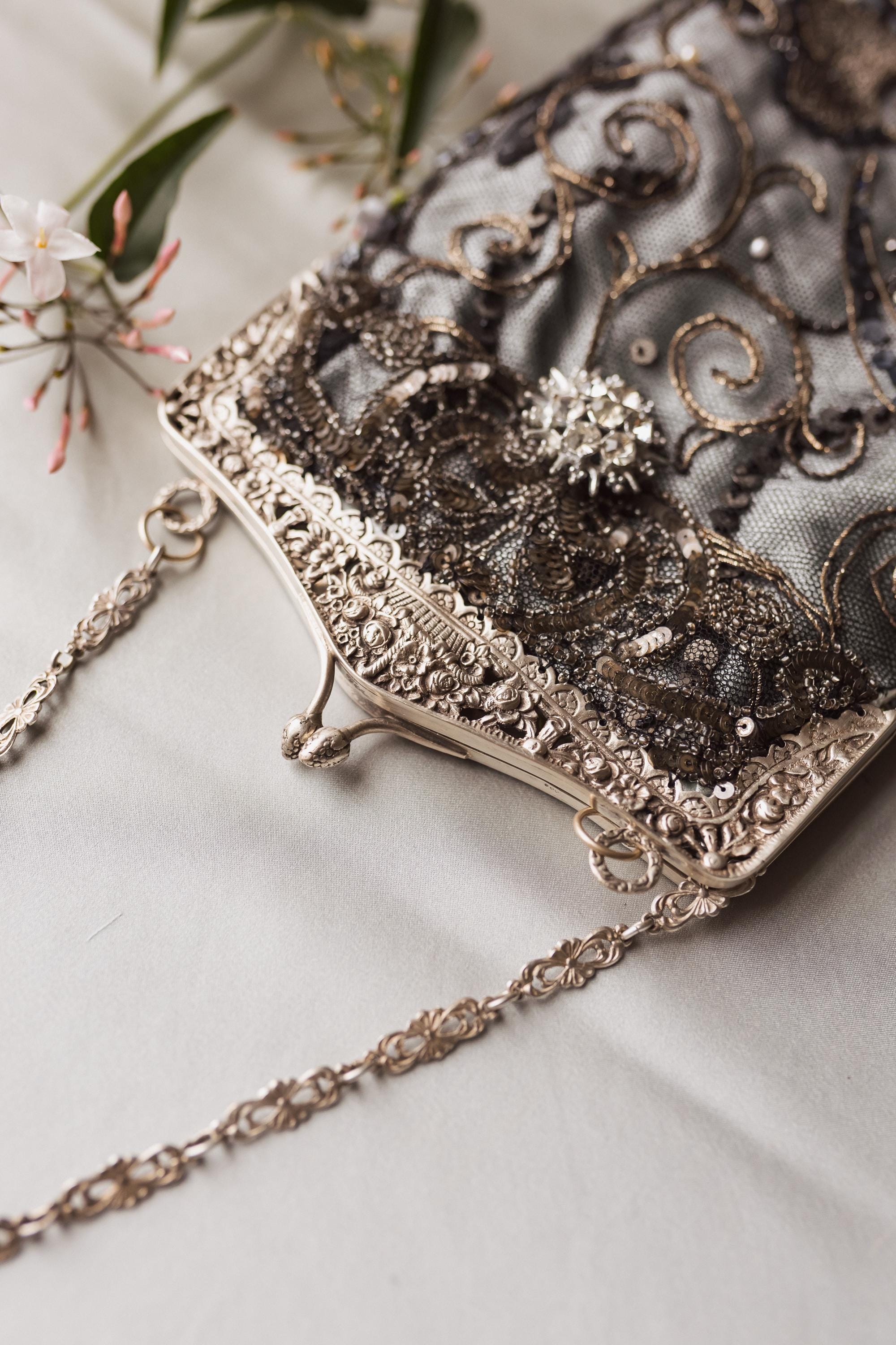 Hand made in Ireland using vintage lace and an Antique silver purse frame .