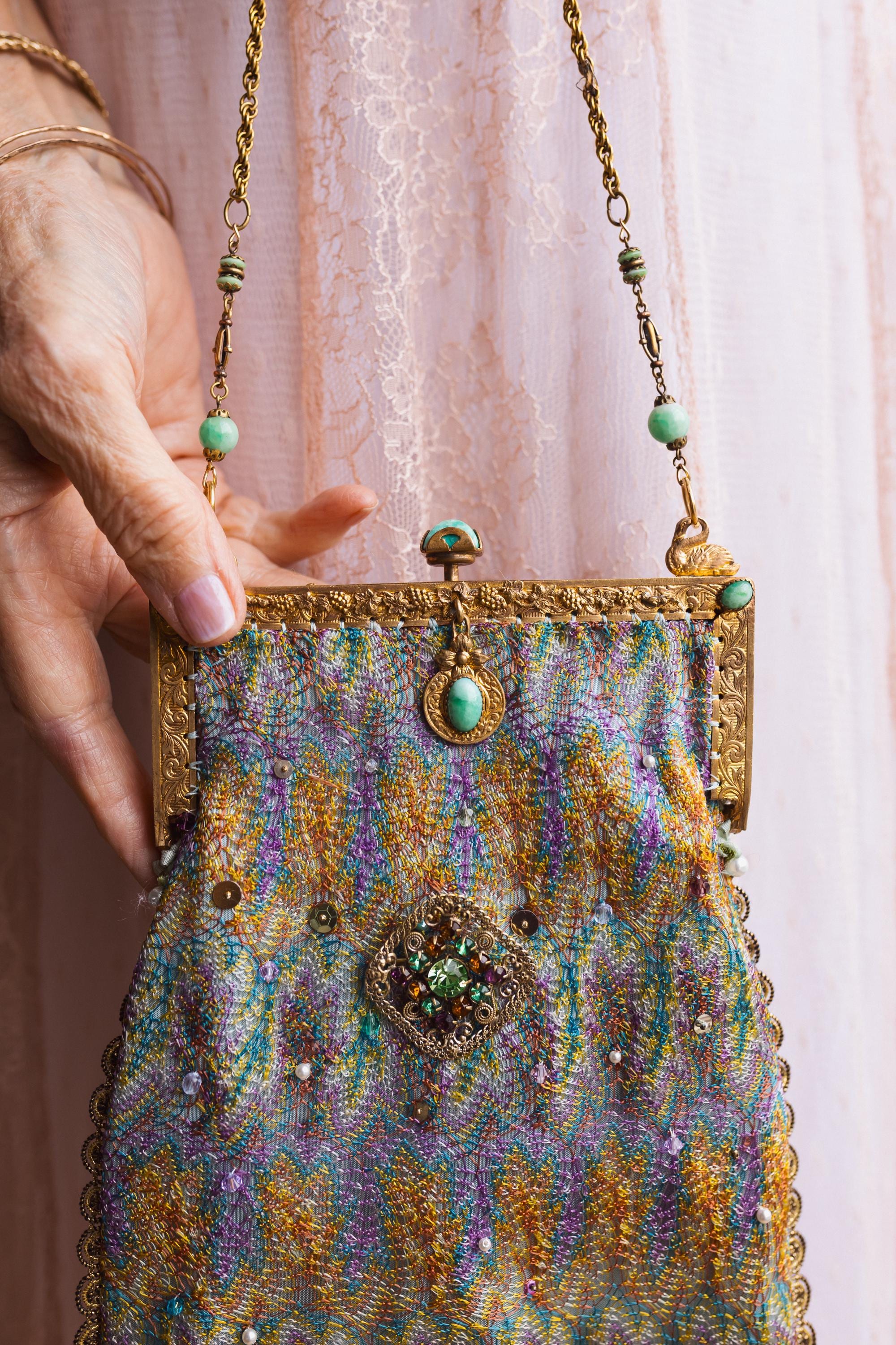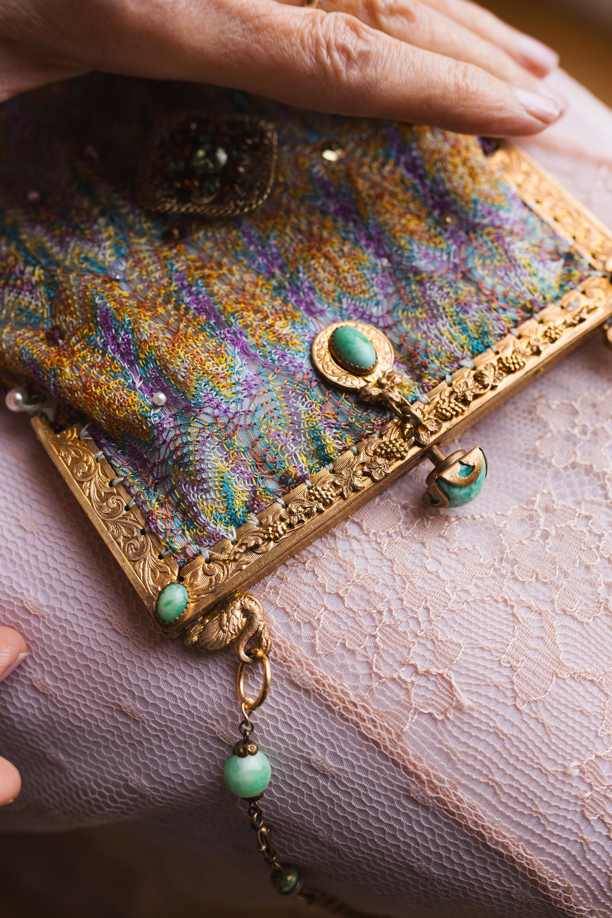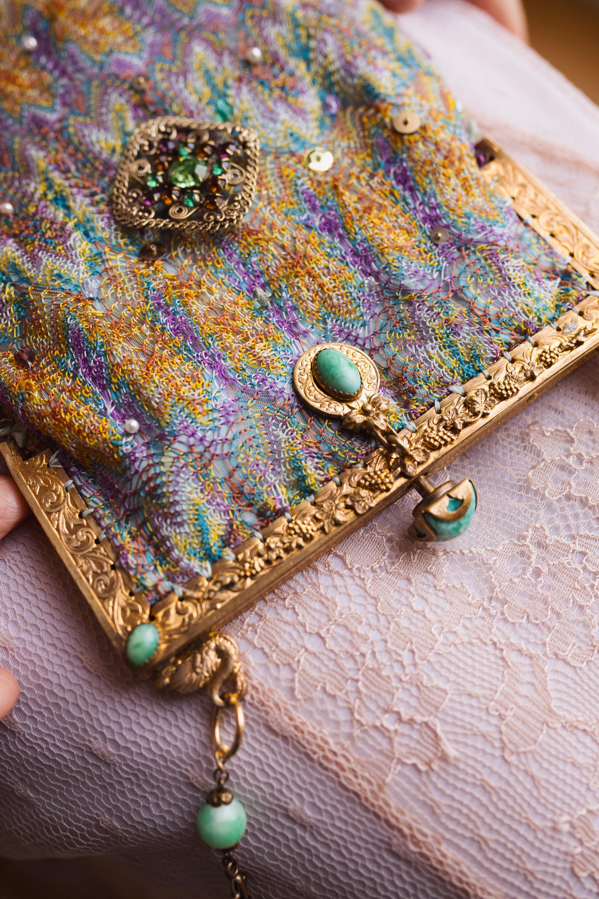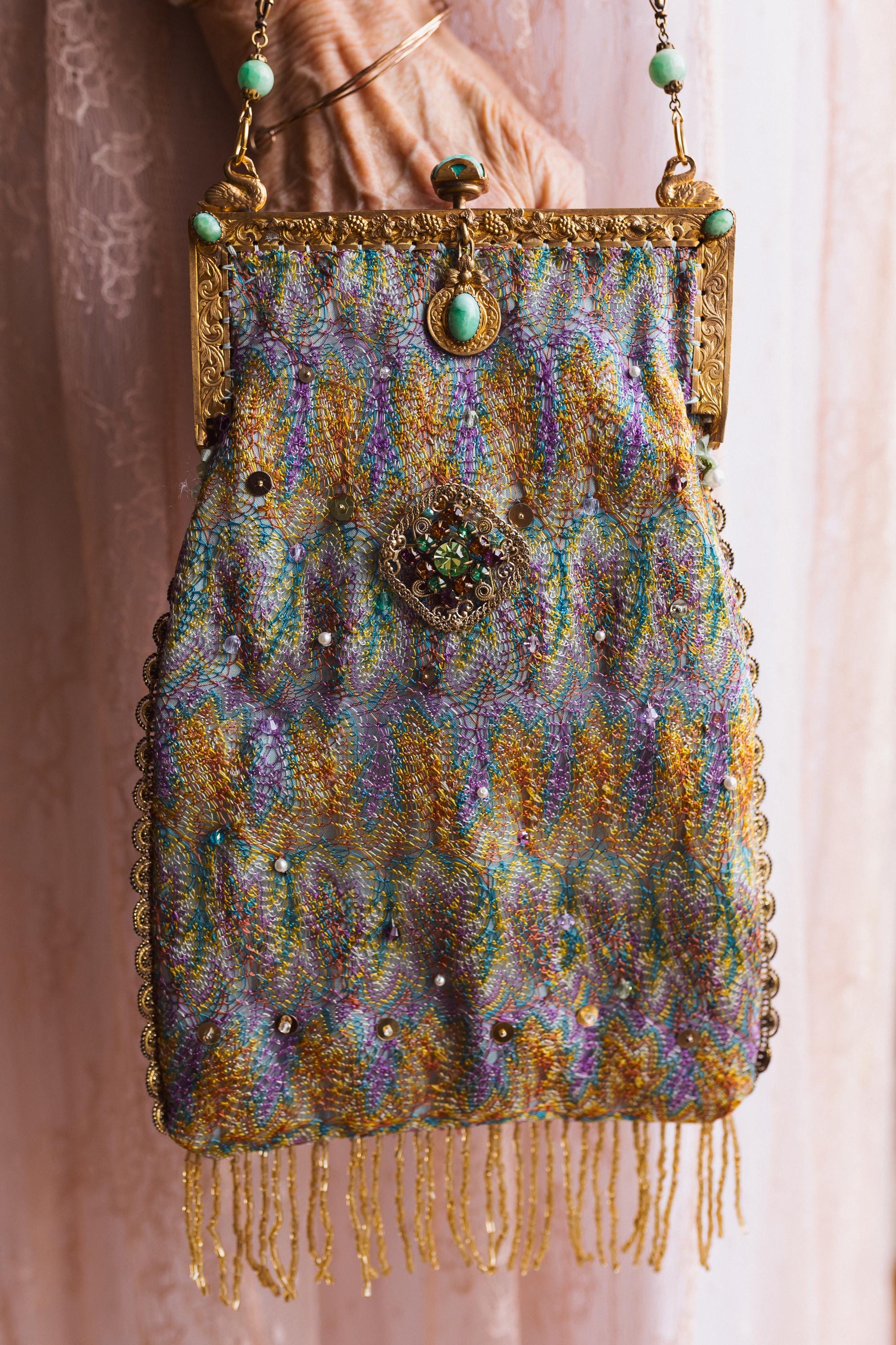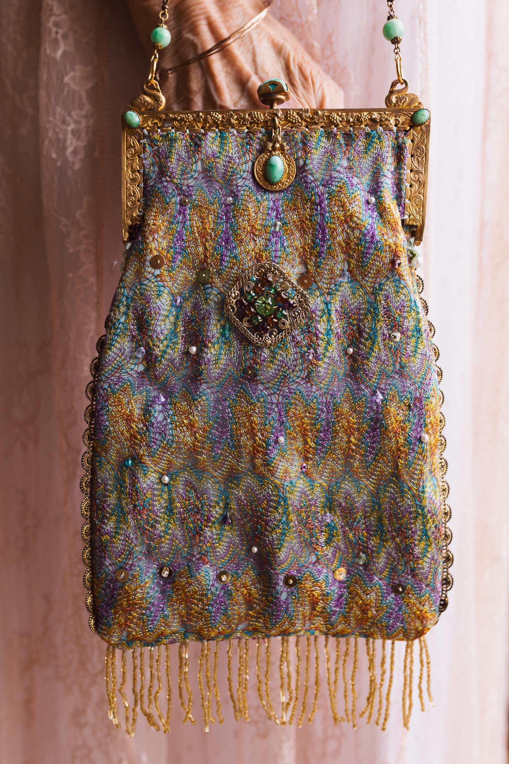 Lovely jewelled gilt purse frame with stones The Frame is small measuring 5 inches wide and unusually marked Gold Plated inside . I have UpCycled and remade the frame in vintage woven silk salvaged from an antique woven silk shawl . It is extremely fine like Gossamer with stunning colours of green and purple . These shawls are very rare and woven from very fine yarn . They date from 1920 and are reminiscent of Missoni . The Missoni family apparently bought the looms hence the similar Zig Zigzag design . I have Handmade the purse in Ireland from treasure all over the world . The Sides are finished in vintage gold braid . Lined in silk and further embellished with crochet flowers and vintage braid . A vintage brooch is pinned to the front .