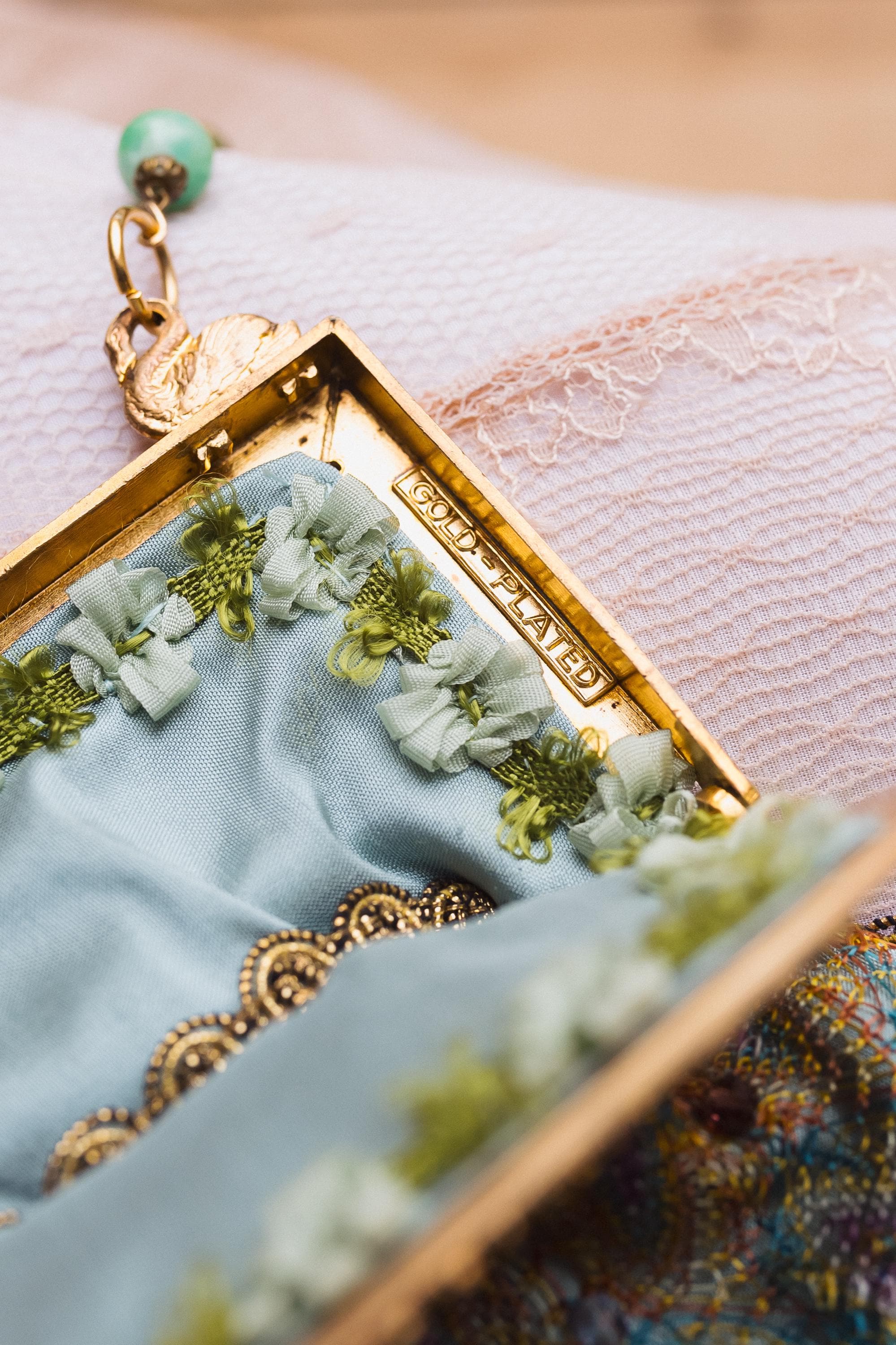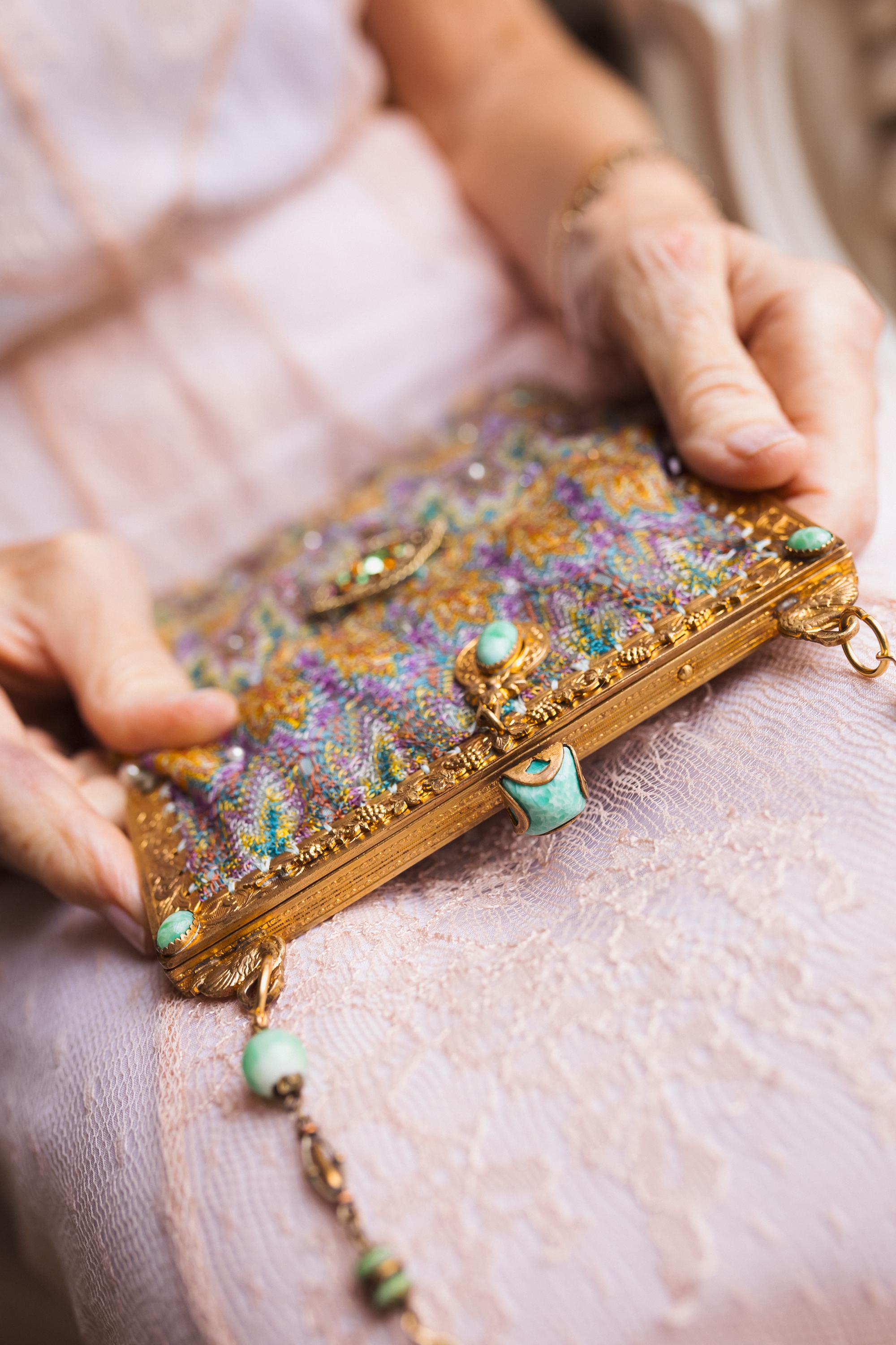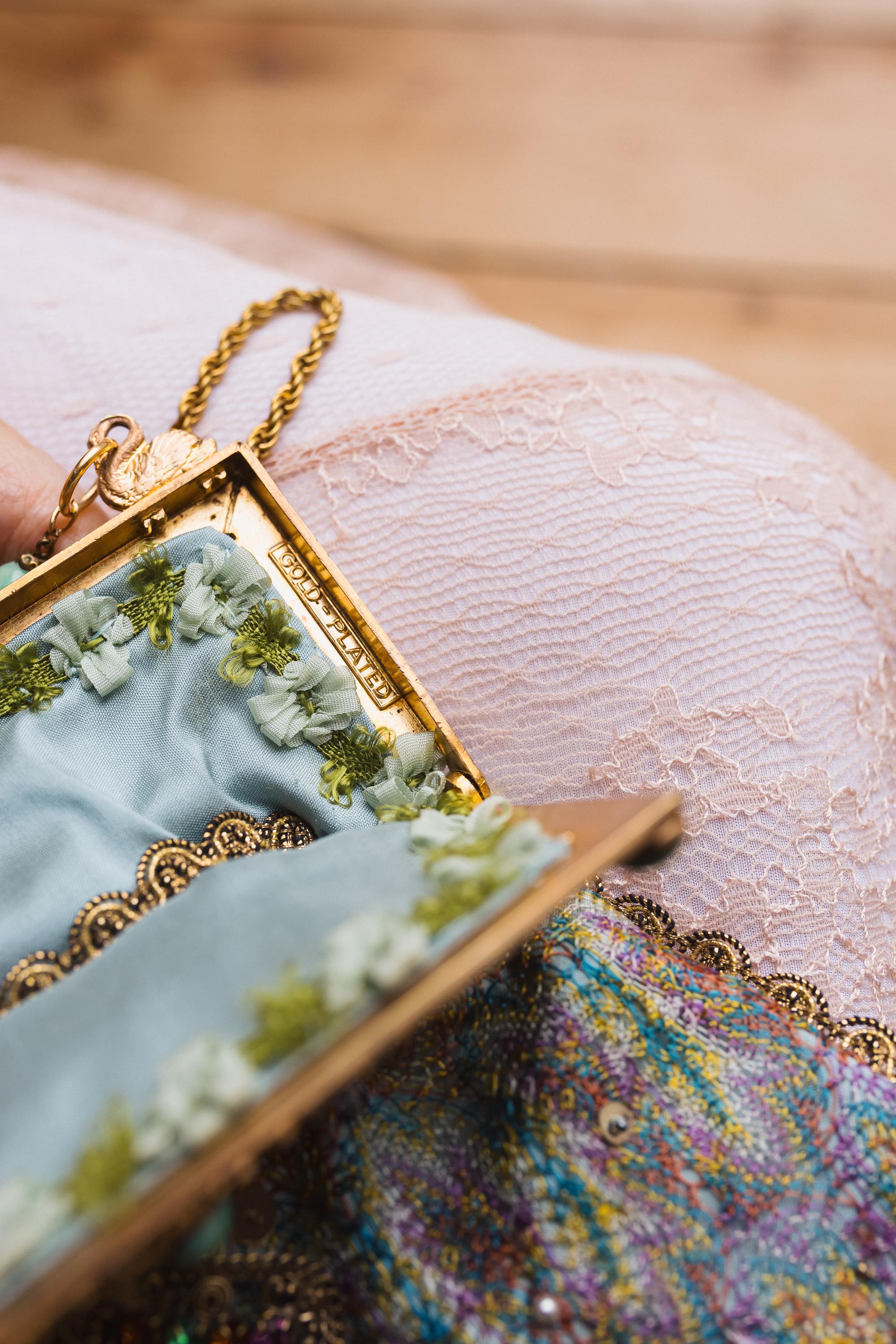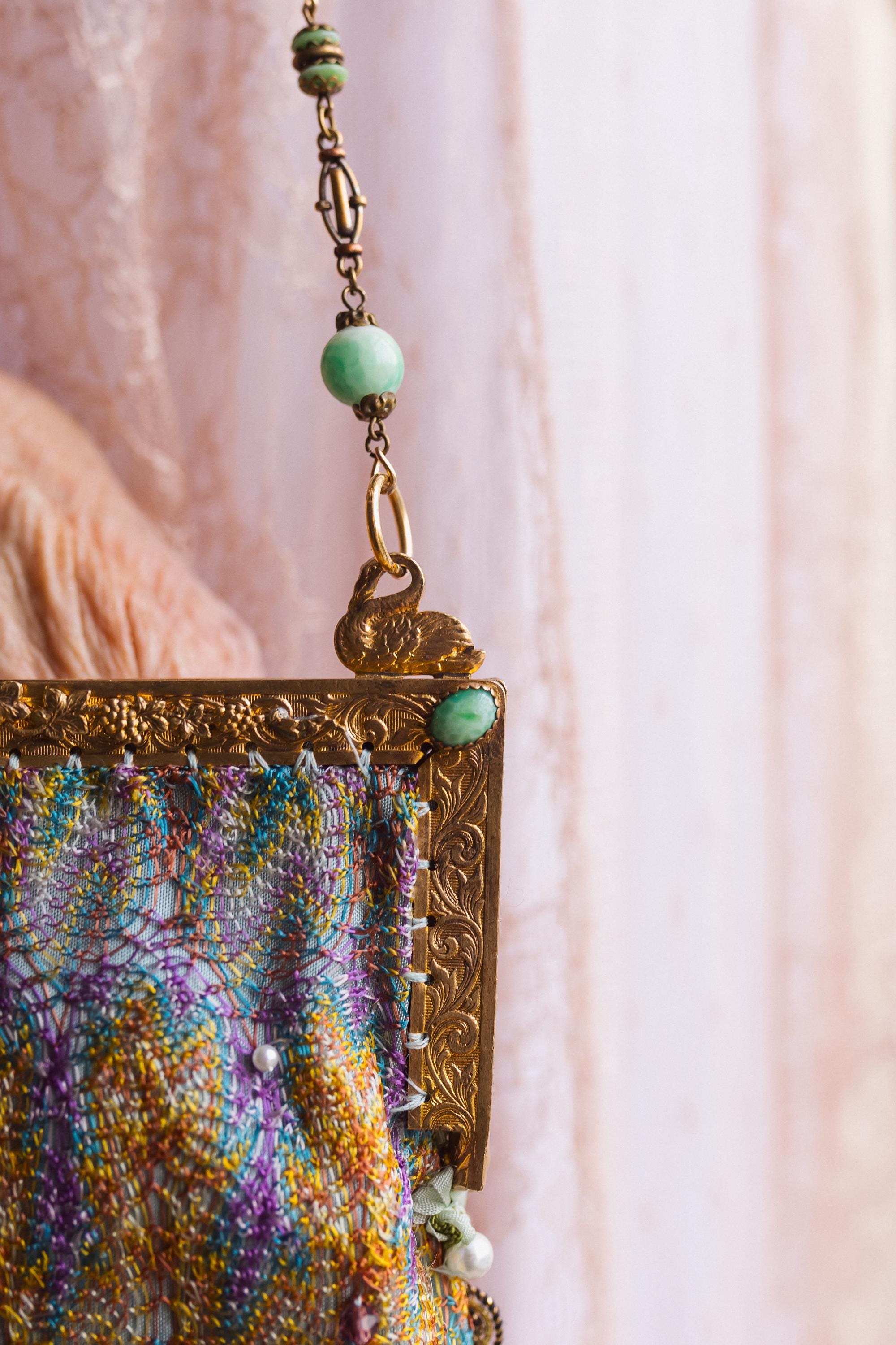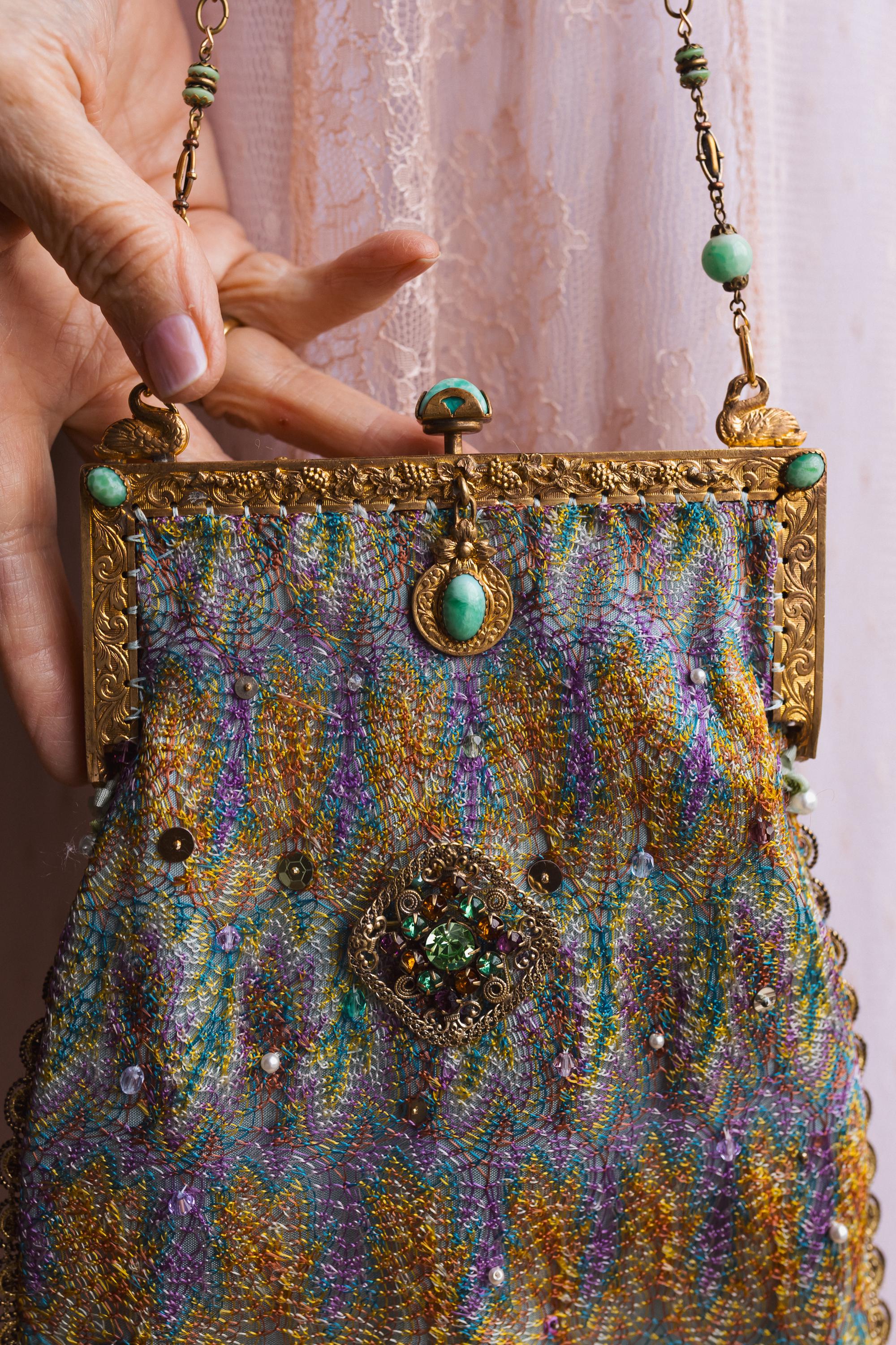 Lovely jewelled gilt purse frame with stones The Frame is small measuring 5 inches wide and unusually marked Gold Plated inside . I have UpCycled and remade the frame in vintage woven silk salvaged from an antique woven silk shawl . It is extremely fine like Gossamer with stunning colours of green and purple . These shawls are very rare and woven from very fine yarn . They date from 1920 and are reminiscent of Missoni . The Missoni family apparently bought the looms hence the similar Zig Zigzag design . I have Handmade the purse in Ireland from treasure all over the world . The Sides are finished in vintage gold braid . Lined in silk and further embellished with crochet flowers and vintage braid . A vintage brooch is pinned to the front .